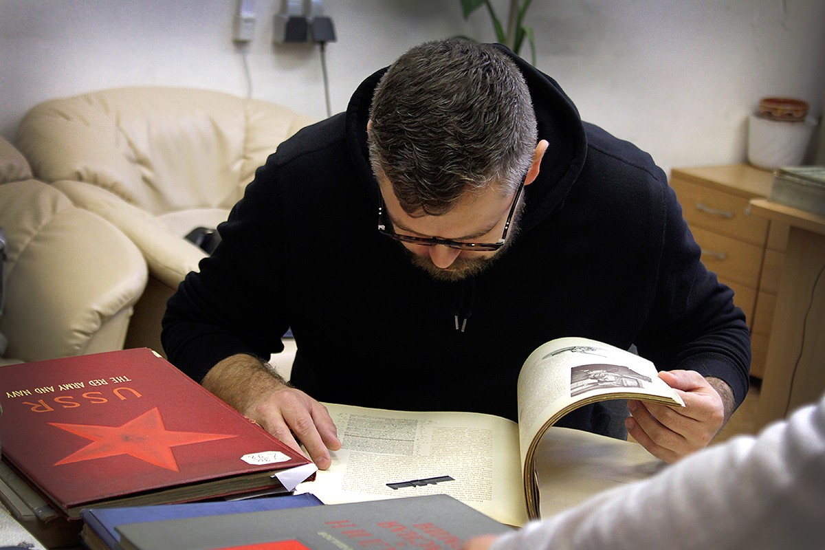 Книжный дизайнер Максим Родин , в процессе выбора «раритетов» для выставки «Книга глазами дизайнера»