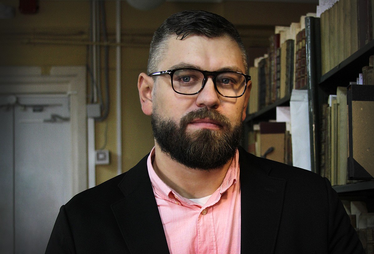 Книжный дизайнер Максим Родин в фондах хранения РГБ, в период подготовки к выставке «Книга глазами дизайнера»