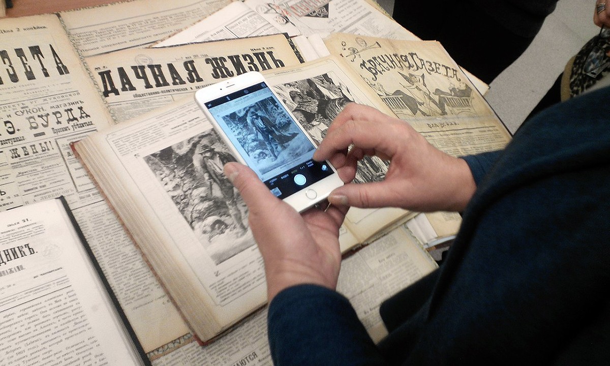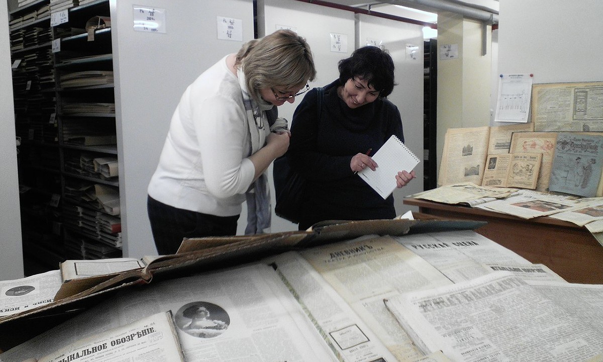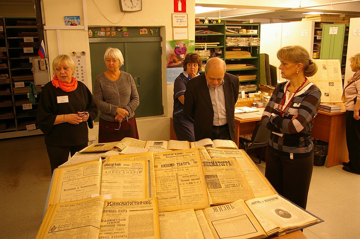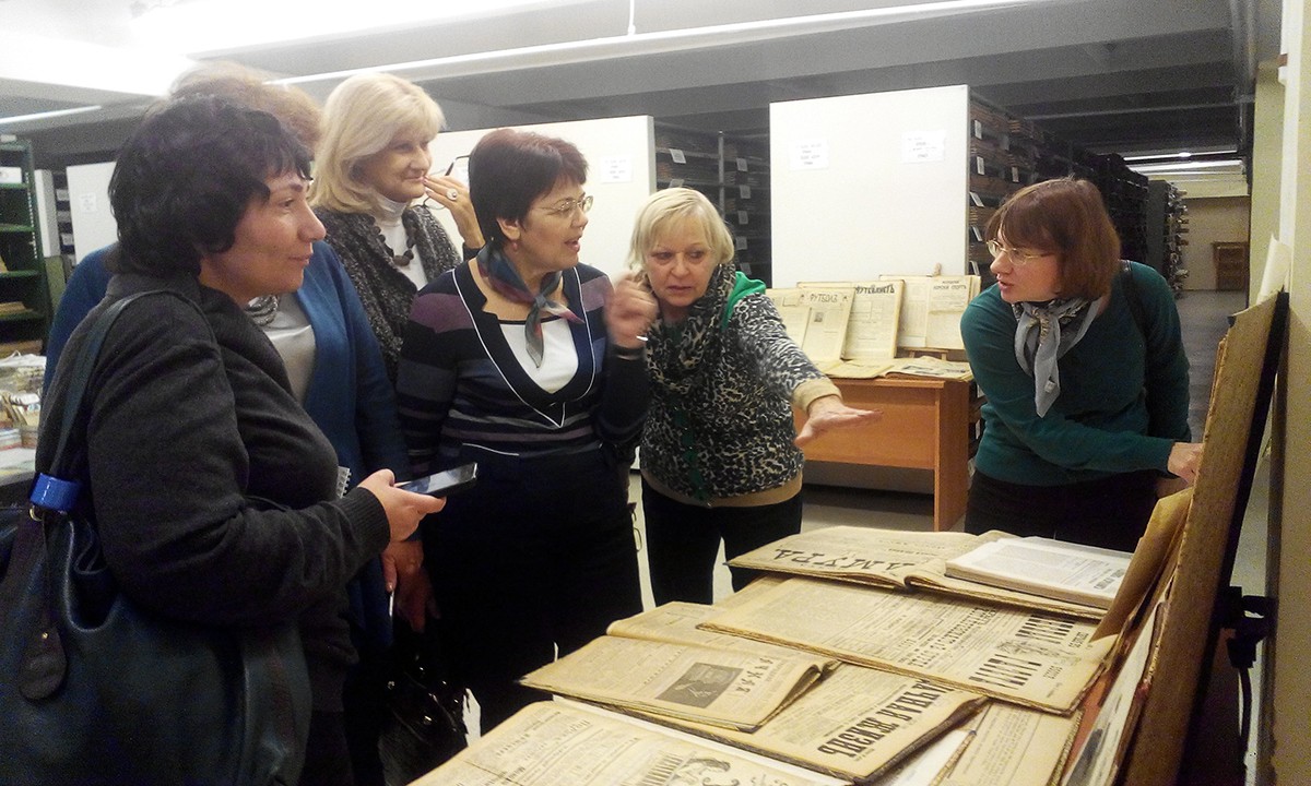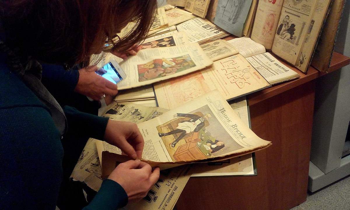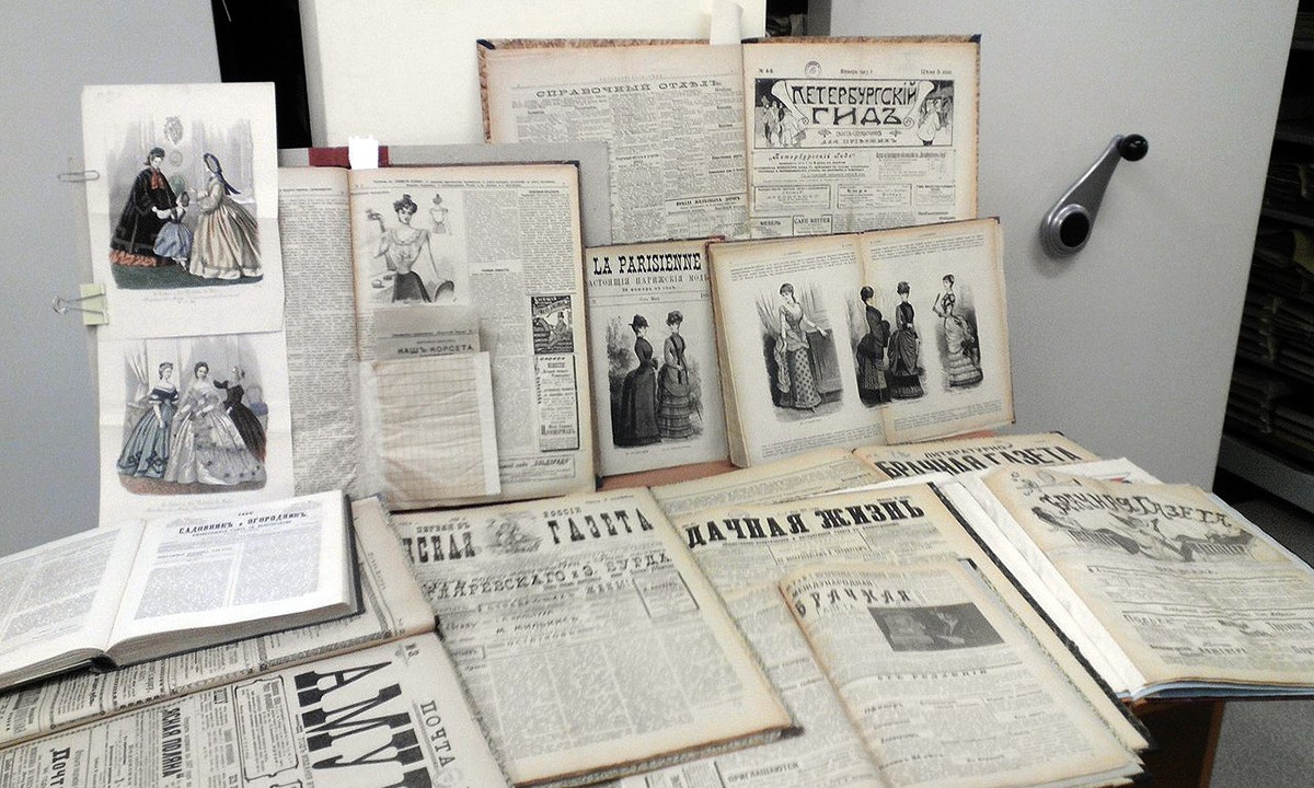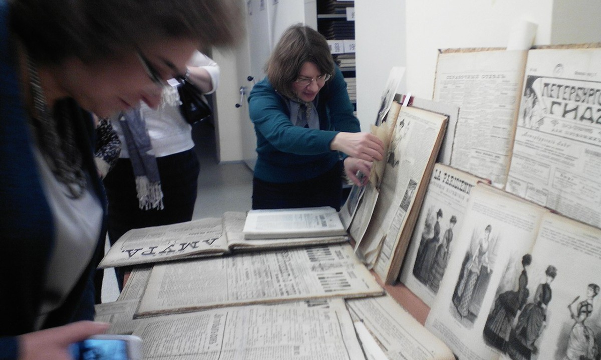 Следующий этап экскурсии — путешествие в отдел газет. Его проводит заведующая отделом Татьяна Ильинична Белоусова. Отдел занимает девять ярусов. Здесь хранится более 5 миллионов газет, с 1800 года и до наших дней. Ежегодно сюда поступает около 7000 наименований газет. Для Библиодня сотрудники отдела выбрали издания конца XIX — начала XX века и сгруппировали их по темам: отраслевые, школьные, спортивные, рассказывающие про досуг москвичей и петербуржцев, моды, про хитрости садоводства и огородничества, новинки музыки, театра и синематографа, сатирические газеты и вызвавшая живейший интерес подборка газет брачных объявлений: