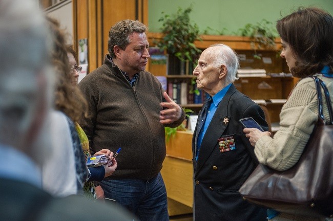 В канун юбилея Победы нельзя было не пригласить на встречу в РГБ фронтовика — выбор организаторов пал на Евгения Войскунского, больше известного читателям своими произведениями в жанре научной фантастики. Войскунский рассказал об эпизодах войны, которые легли в основу его книги «Кронштадт». В романе воссозданы важнейшие этапы битвы на Балтике, начиная с трагического перехода флота из Таллина в Кронштадт в августе 1941 до снятия блокады в январе 1944.