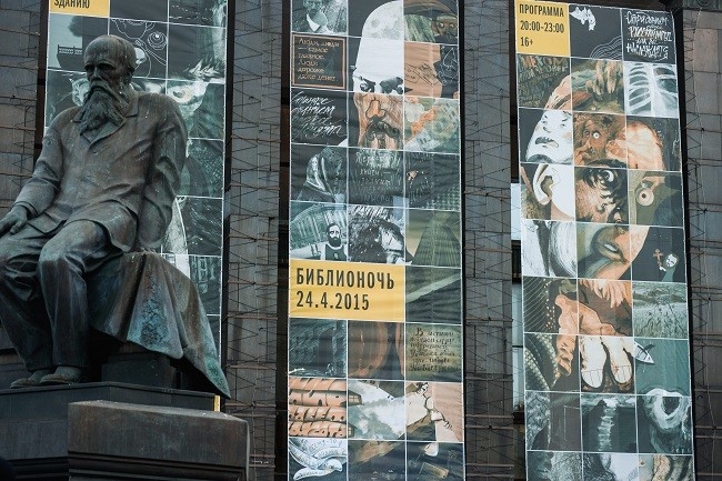 «Библионочь» в РГБ уже стала традицией: длинные баннеры на фасаде главного здания в этом году напоминали, что в конце апреля в библиотеке снова допоздна воцарится неформальная атмосфера. Однако традиция не отменила эмоционального подъёма, который испытали все участники «Библионочи».