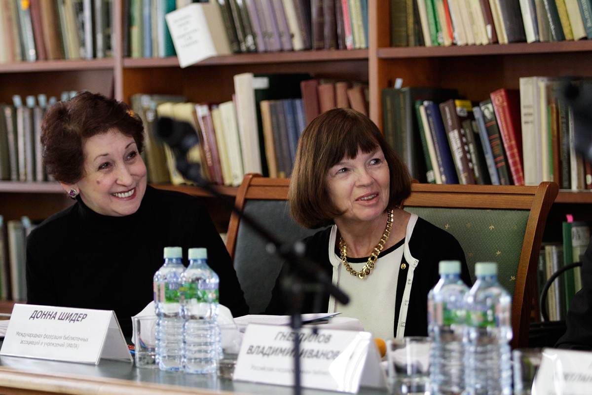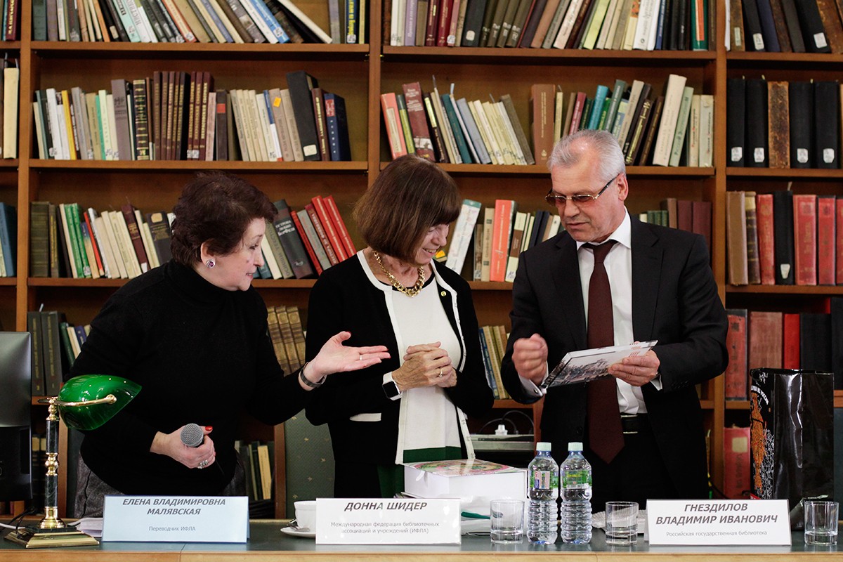 19 апреля Российская государственная библиотека принимала г-жу Донну Шидер — действующего президента ИФЛА, прибывшую в Россию с профессиональным визитом, организованным по инициативе Всероссийской государственной библиотеки иностранной литературы имени М. И. Рудомино (ВГБИЛ). ИФЛА — Международная федерация библиотечных ассоциаций и учреждений (англ. International Federation of Library Associations) — международная организация, членами которой являются библиотеки, национальные библиотечные организации и информационные службы. Всего в ней состоит более 1600 членов из 150 стран мира. Цель ИФЛА — сотрудничество библиотек всего мира и развитие библиотечно-информационной работы. На конгрессах ИФЛА библиотечное сообщество может регулярно встречаться, обмениваться мнениями, опытом, делиться лучшими идеями и формировать общую линию развития библиотек в мире.
