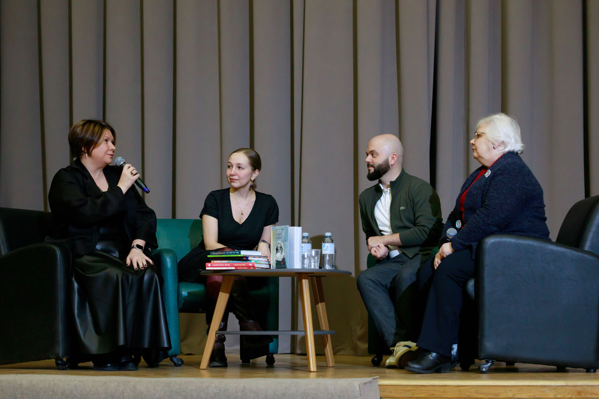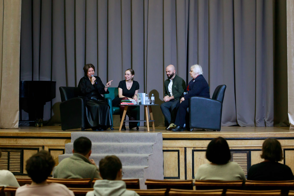 • Слева направо: филолог, преподаватель, специалист по современной литературе, заместитель директора Департамента ключевых партнёрских программ РГБ Анна Делианиди, главный редактор издательства «КомпасГид» Марина Кадетова, издатель «КомпасГид» Виталий Зюсько, писатель и редактор Ольга Громова