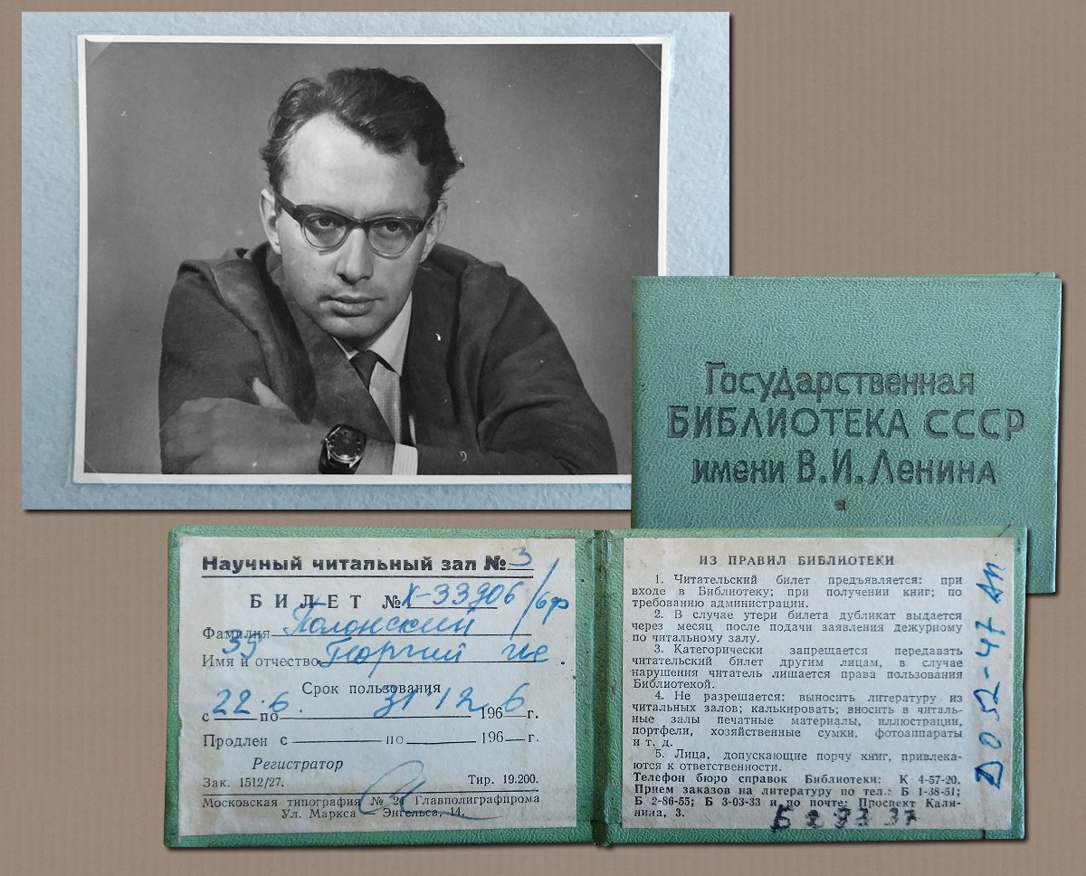 Читательский билет в научный читальный зал Государственной библиотеки СССР имени В. И. Ленина, выданный Георгию Полонскому в 1966 году. На фото: Георгий Полонский. Из личного архива сценариста