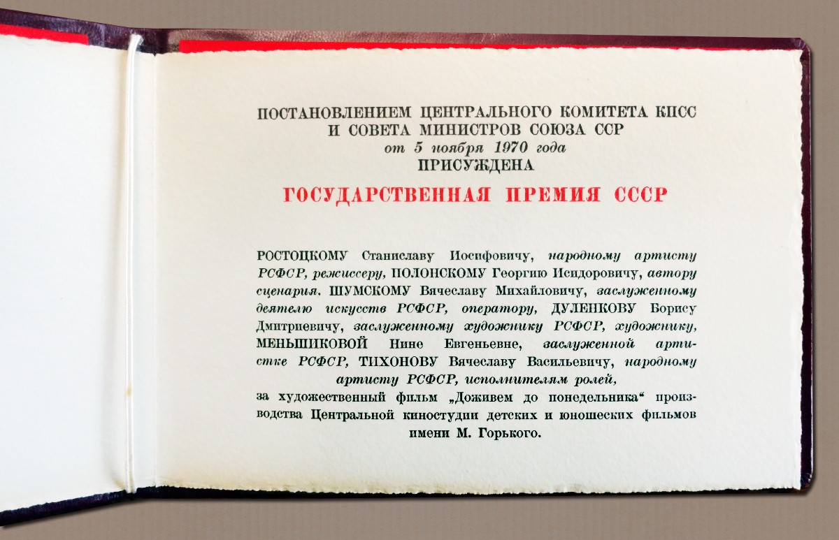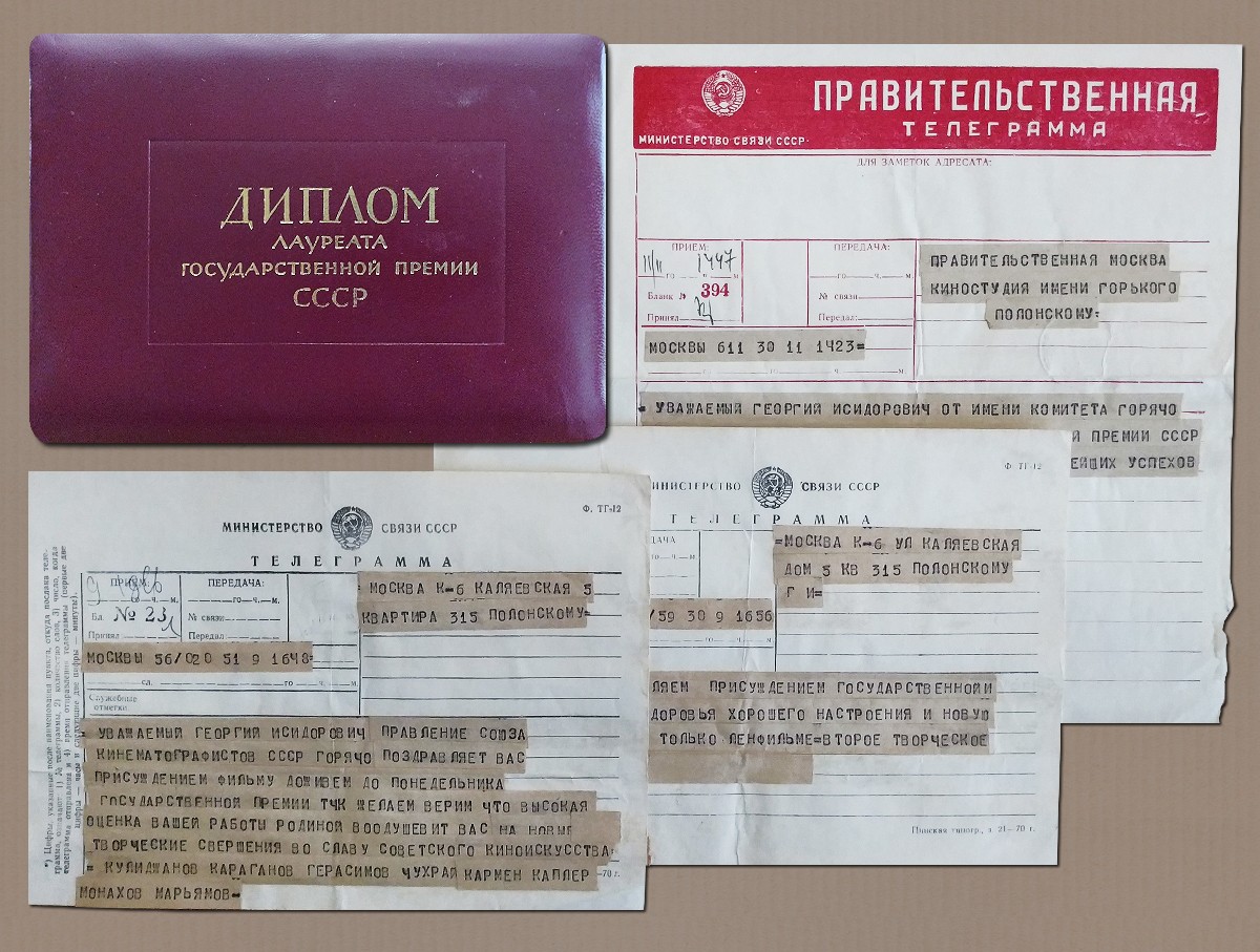 Диплом лауреата Государственной премии СССР, присуждённой Георгию Полонскому в 1970 году за сценарий художественного фильма «Доживём до понедельника». Поздравительные телеграммы, присланные Георгию Полонскому. Из личного архива сценариста