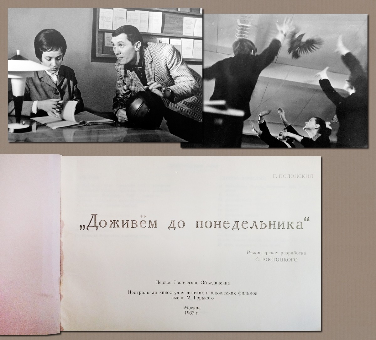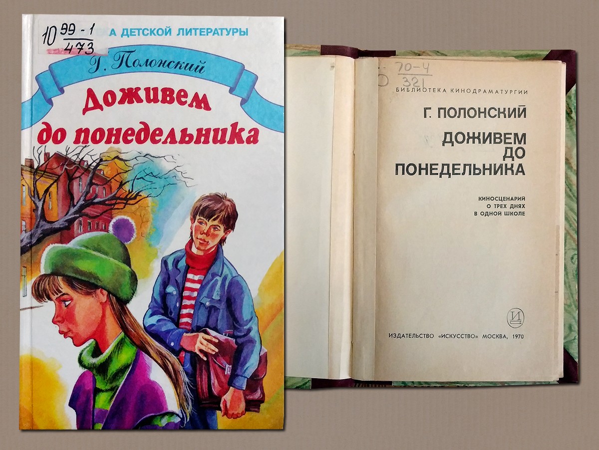 Справа: Полонский, Георгий Исидорович. Доживём до понедельника : Киносценарий о трёх днях в одной школе. Москва : Искусство, 1970. Из фондов РГБ