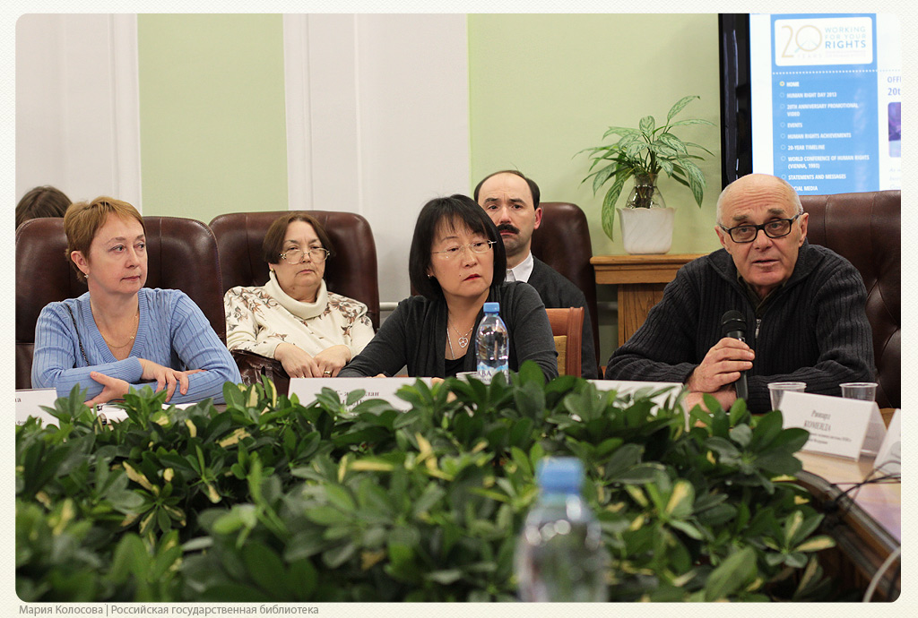 Вспомнить о событии в РГБ собрались около сорока человек — представители Управления Верховного Комиссара ООН по правам человека, участники Венской конференции и множество людей, которым небезынтересна работа организации. Директор информационного центра ООН Александр Горелик рассказал об изменениях в поведении правозащитников: «Многие знают, что в деятельности ООН есть три столпа: мир и безопасность, развитие, права человека. В области прав человека меня в последнее время очень привлекает продвинутая и проактивная позиция наших коллег и из Женевского управления Верховного Комиссара по правам человека, и из других организаций, занимающихся правами человека. В основном, у нас идет экспертная работа — доклады, встречи, дискуссии. А в последние годы на фоне головоломных событий, которые происходили в Северной Африке и на Ближнем Востоке, наши коллеги были поставлены перед серьезными дилеммами, в которых привычный академический подход не помогал. И Управление Верховного Комиссара стало занимать более продвинутую и четкую позицию в пользу сохранения конкретных человеческих жизней, потому что гибнет очень много людей, разрушения затрагивают самые основы обществ, как, например, в Ливии и Сирии. Приходится занимать очень ясные и односторонние позиции. Это не очень в духе сотрудников ООН, которые обычно ищут „золотую середину“ и говорят подчас эзоповым языком. А здесь выбор очень четкий, в белых перчатках работать не получается. Сегодня ООН тоже на переднем крае борьбы за жизнь».