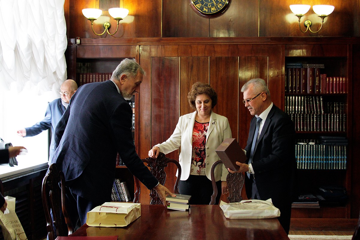 В заключение визита стороны обменялись подарками. Владимир Иванович Гнездилов и заместитель генерального директора РГБ по внешним связям и выставочной деятельности Наталья Юрьевна Самойленко вручили гостям книгу-альбом «Российская государственная библиотека». В свою очередь, сербская делегация преподнесла книги авторства господина Селимира Радуловича. Если русско-сербский читальный зал в стенах РГБ будет открыт, эти книги займут в нём своё законное почётное место.