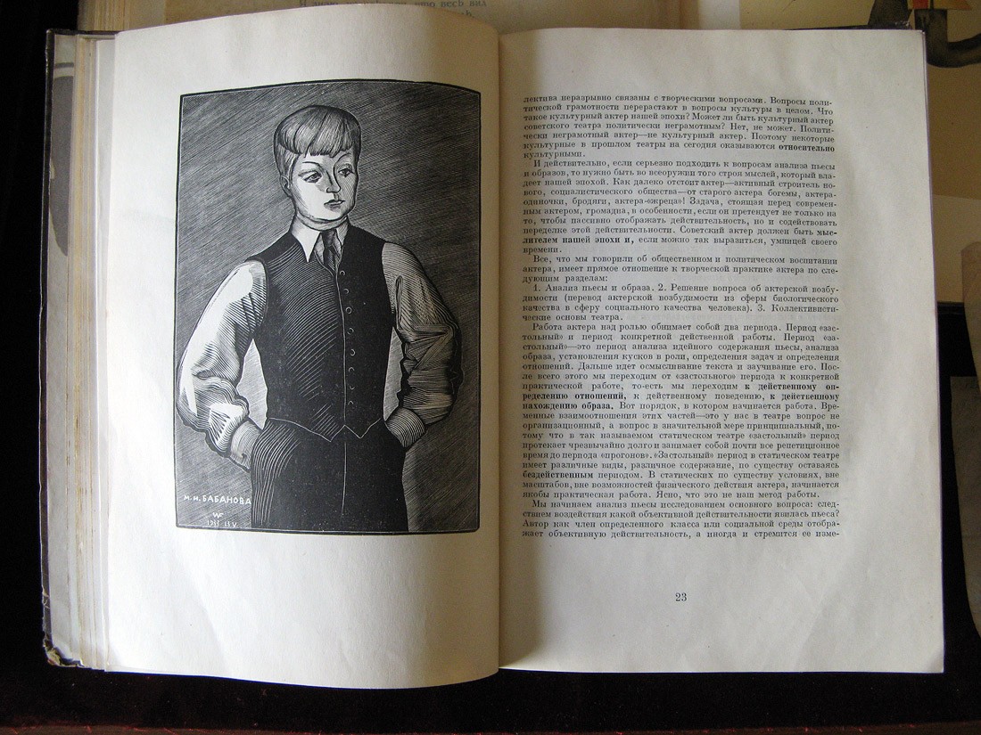 Сборник весьма идеологизирован. «Как далеко отстоит актер — активный строитель нового, социалистического общества, — рассуждает автор одной из статей, — от старого актера богемы, актера-одиночки, бродяги, актера — „жреца“! Советский актер должен быть мыслителем нашей эпохи, если так можно выразиться, умницей своего времени». Особый жанр — театральные программки, доносящие дыхание времени. И прежде всего отношение к зрителю. Так, в предложенной вниманию посетителей программе спектакля МХТ «На дне» (1905 год) примечательно вежливое, но категоричное уточнение: «Ввиду настойчивых заявлений со стороны публики дирекция театра покорнейше просит занимать места до открытия занавеса и во время действия в зал не входить». |