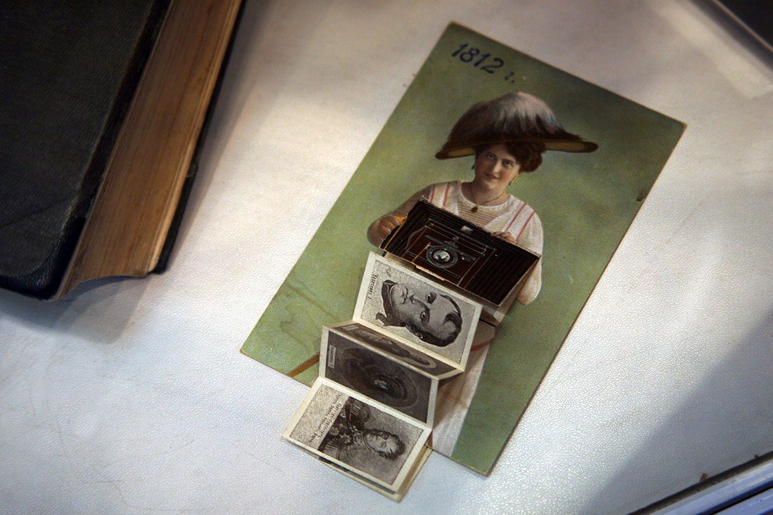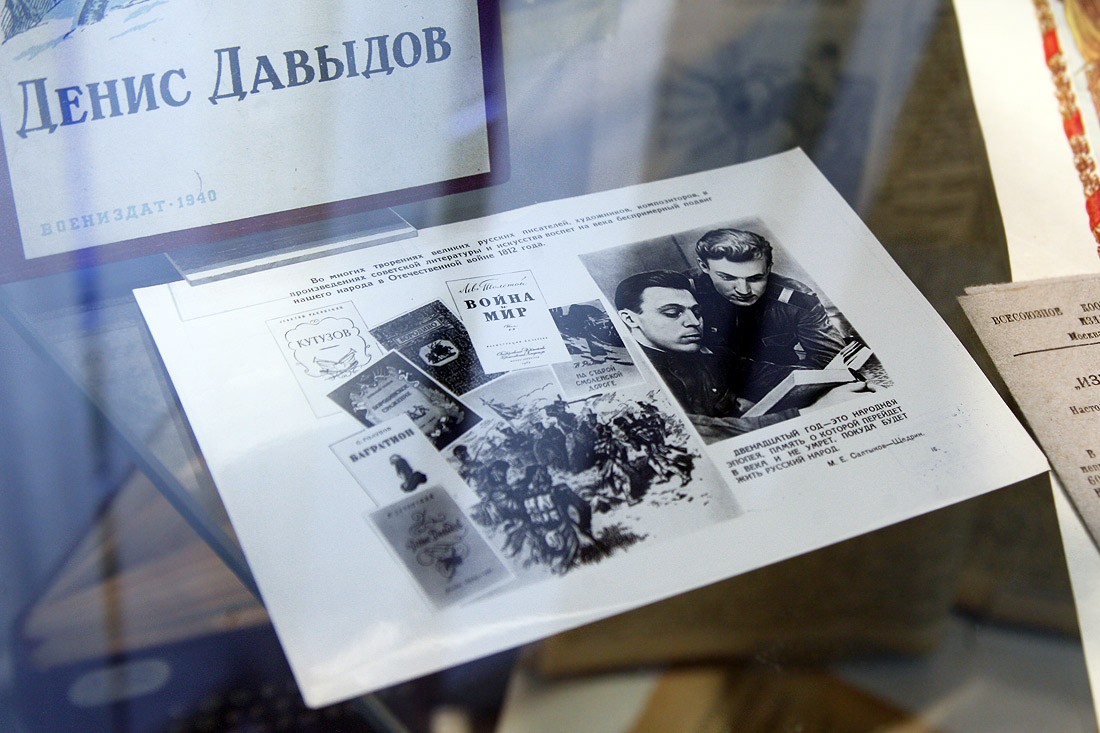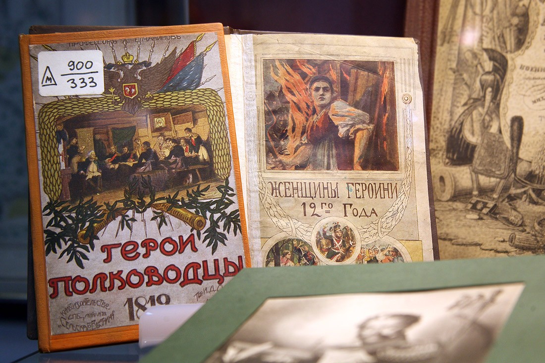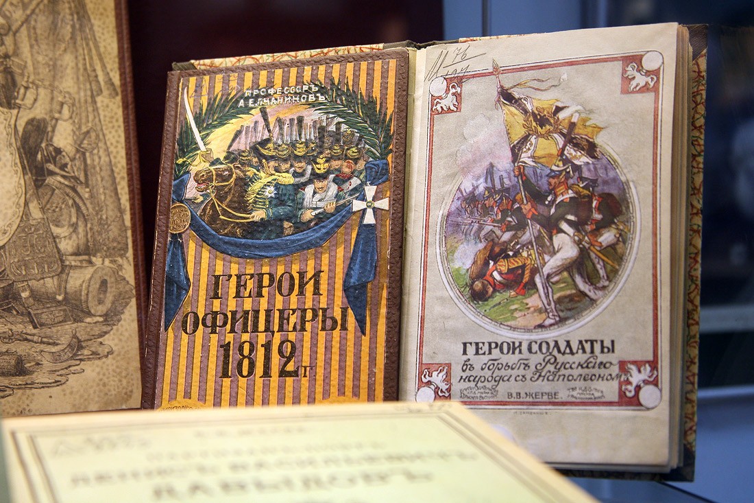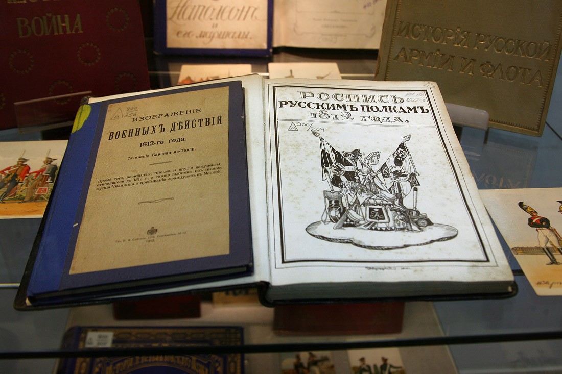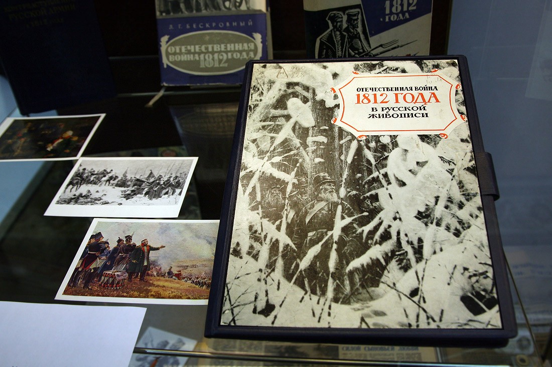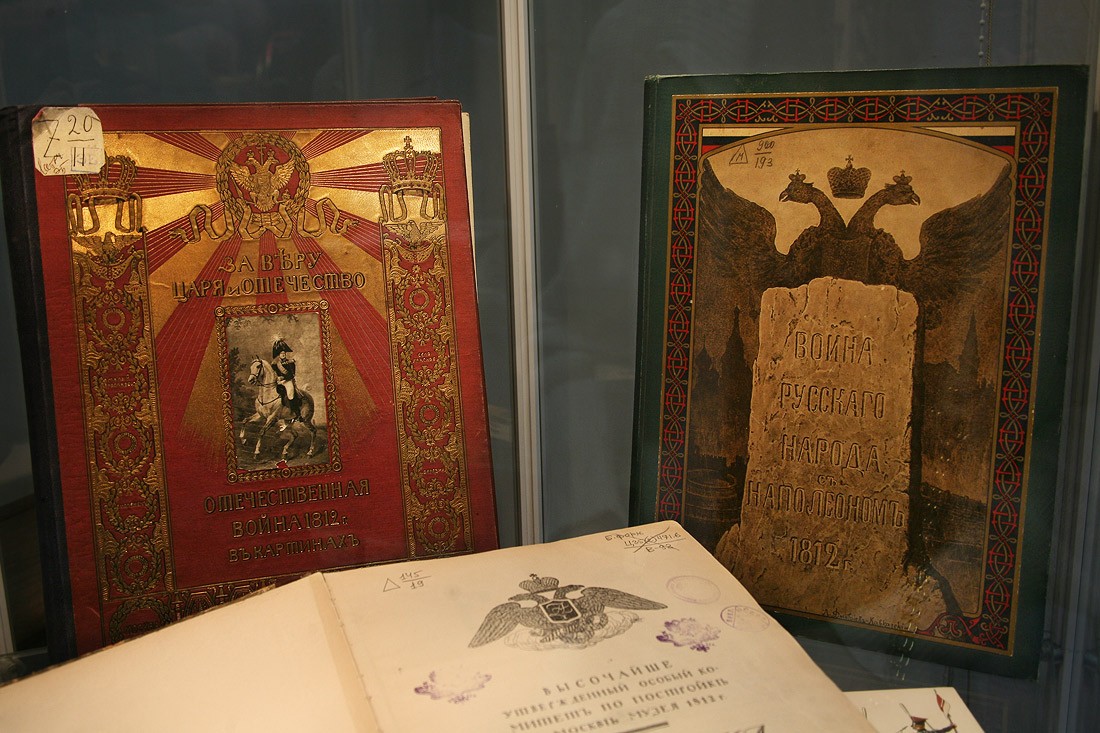 Кроме оригиналов писем, на выставке немало других подлинных документов времени войны с Наполеоном: монеты России и Франции 1812 года, копия приказа Наполеона о начале войны с Россией (которую он называет «второй Польской», призванной прекратить «пятидесятилетнее влияние России на дела Европы»), латуневый ополченский крест, открытки, военные карты и, конечно, книги. Из них самые интересные и редкие — издания, относящиеся к полковой историографии, которые выпускались очень небольшими тиражами и которые были у всех русских полков — красочные, с золотым тиснением, в ярких бархатных обложках, вроде живописного «Исторического обозрения лейб-гвардии Измайловского полка