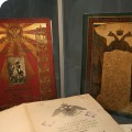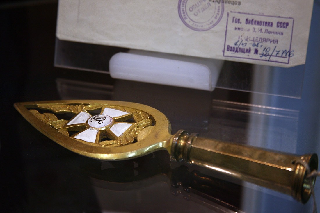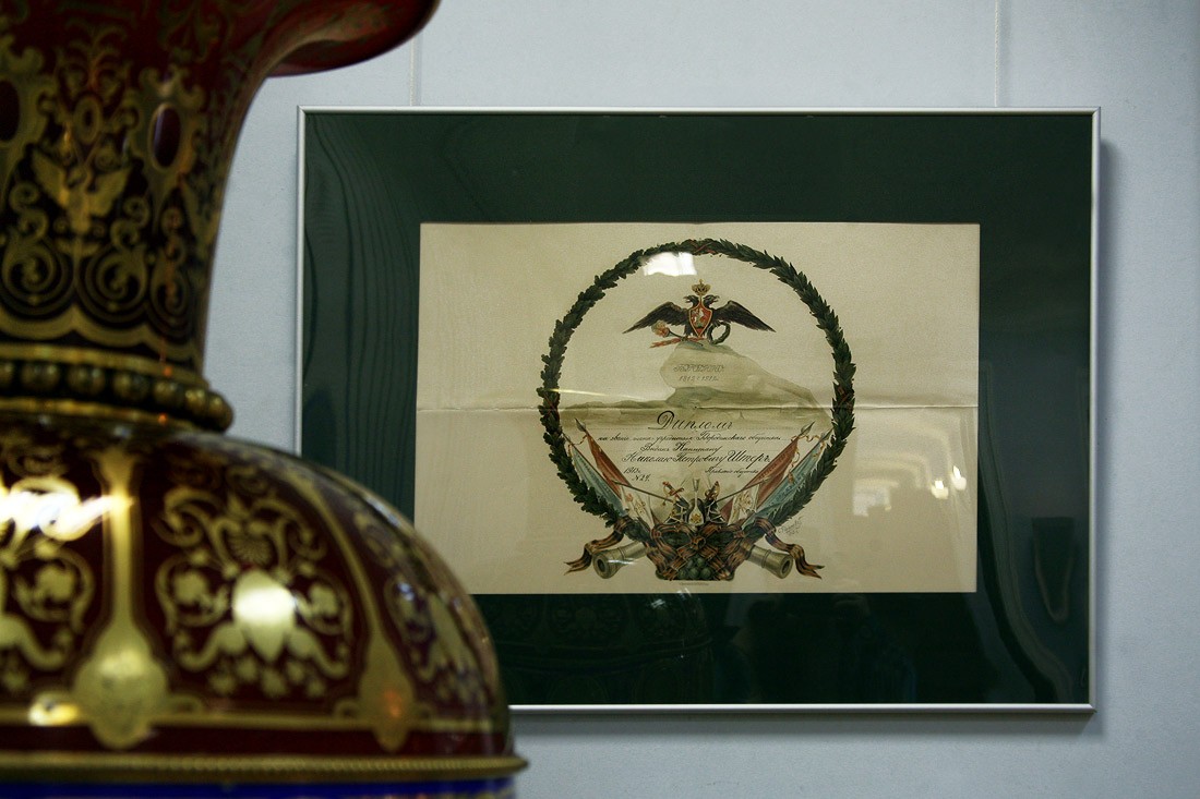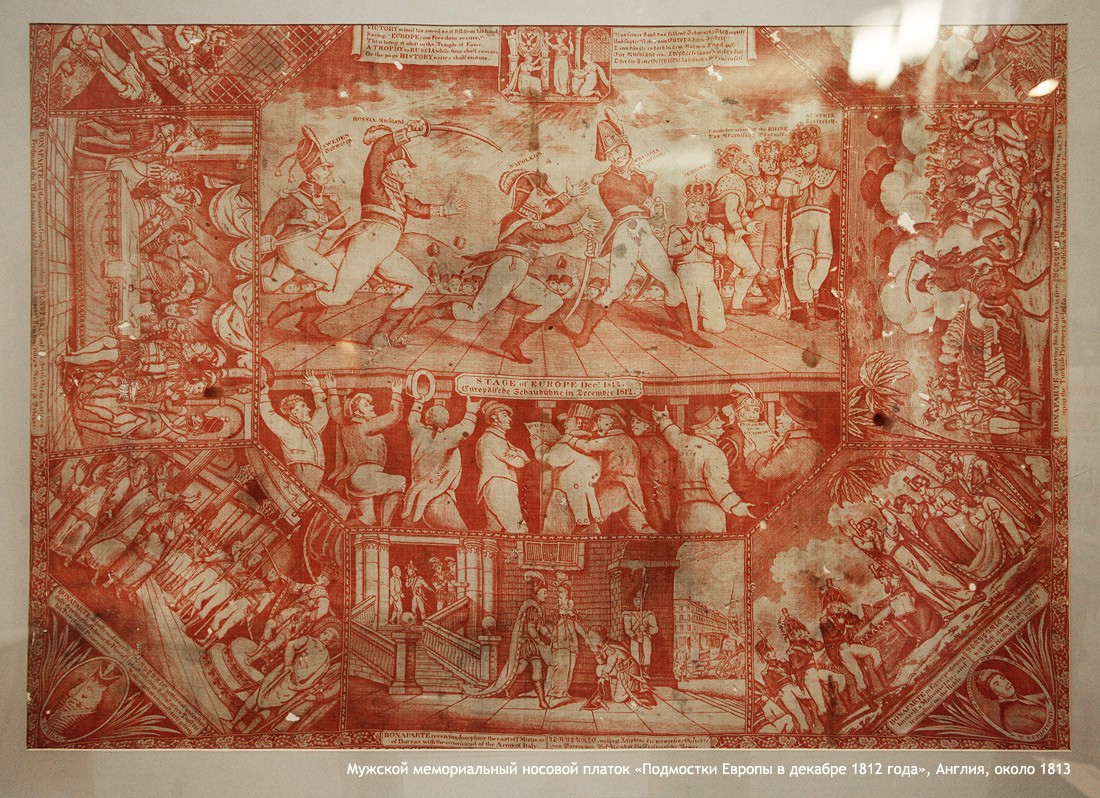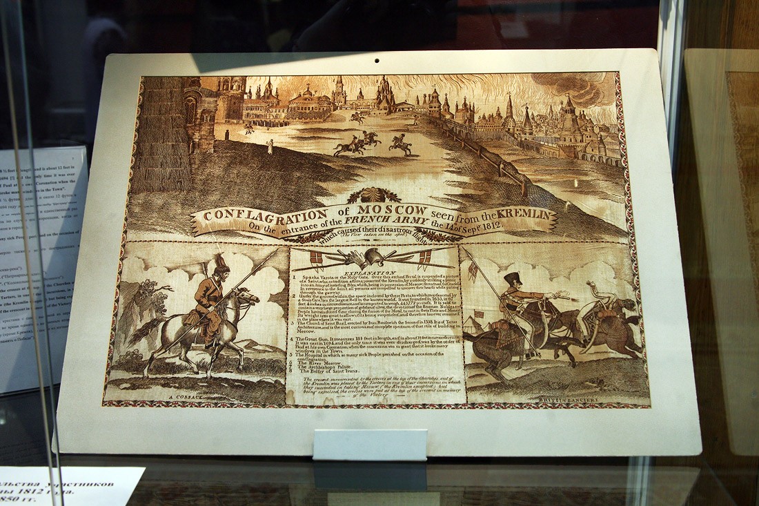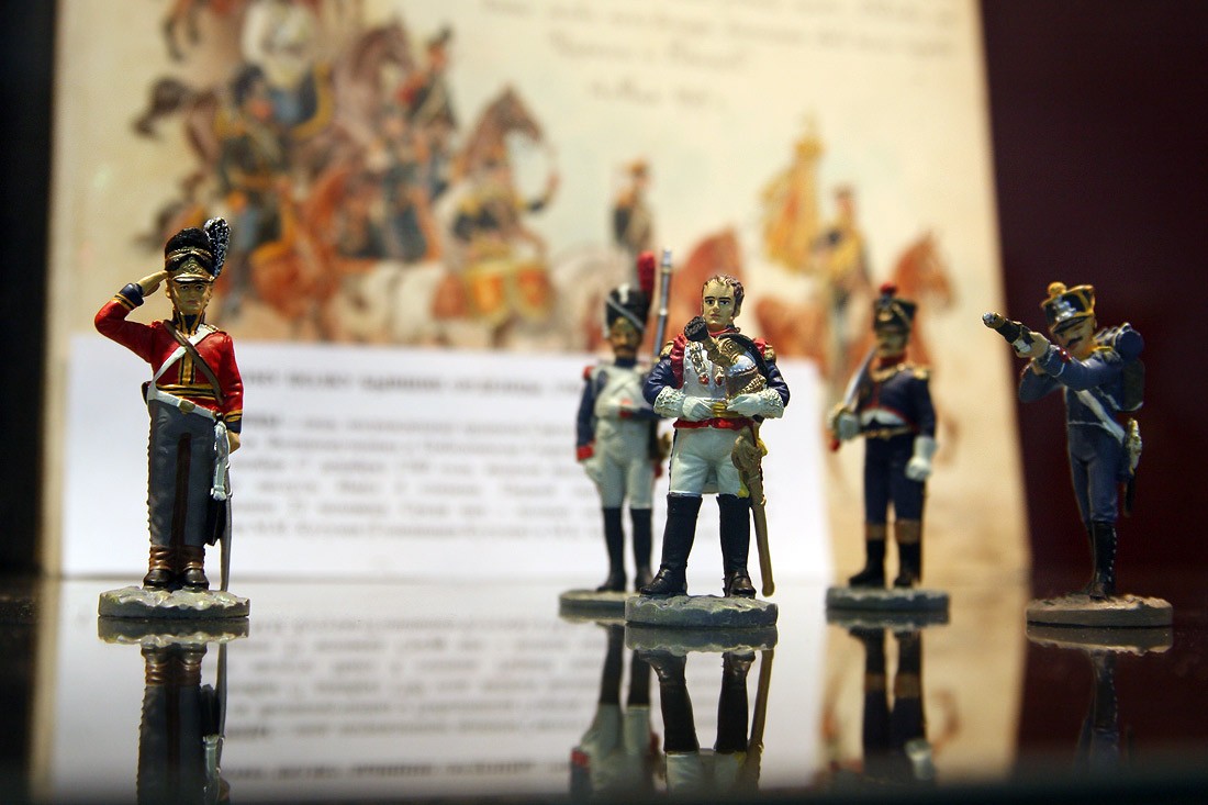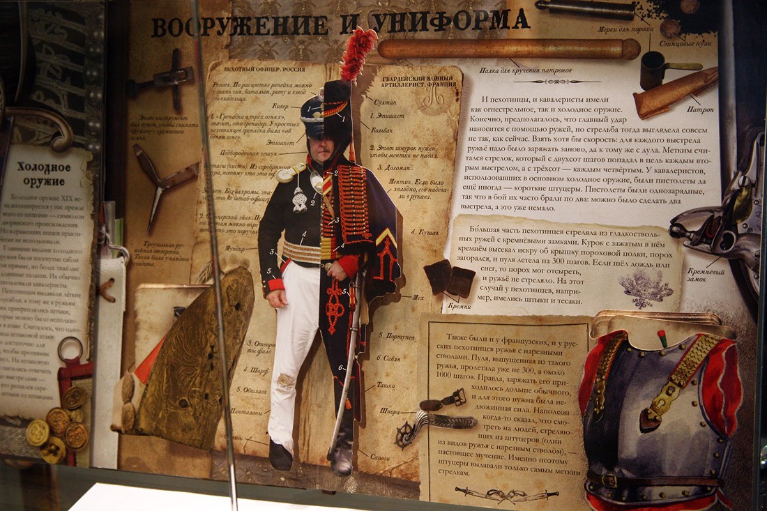 Кроме оригиналов писем, на выставке немало других подлинных документов времени войны с Наполеоном: монеты России и Франции 1812 года, копия приказа Наполеона о начале войны с Россией (которую он называет «второй Польской», призванной прекратить «пятидесятилетнее влияние России на дела Европы»), латуневый ополченский крест, открытки, военные карты и, конечно, книги. Из них самые интересные и редкие — издания, относящиеся к полковой историографии, которые выпускались очень небольшими тиражами и которые были у всех русских полков — красочные, с золотым тиснением, в ярких бархатных обложках, вроде живописного «Исторического обозрения лейб-гвардии Измайловского полка