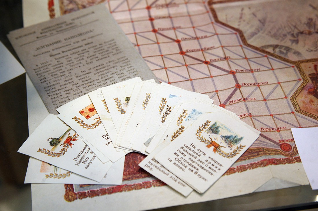 Стотридцатилетний юбилей войны вспоминали в течение всех военных лет: выходили книги («Разгром Наполеона», «Битва за Бородино», «Из боевого прошлого русской армии: документы о доблести и героизме русских солдат и офицеров»), выпускались патриотические плакаты — на одном из них фигура Михаила Кутузова в окружении красных советских знамен провожает взглядом уходящие на войну танки. Примечателен и недавно найденный в архиве Макарова экземпляр настольной исторической игры для подростков «Изгнание Наполеона». «24 июня 1812 года без объявления войны, разноплеменная армия Наполеона из 600 тысяч человек, переправившись через пограничную реку Неман, вторглась в Россию. Русская армия, насчитывавшая всего около 200 тысяч человек при 900 орудиях, вынуждена была отступать перед лицом превосходящих сил врага», — сказано в аннотации к этой красивой игре. В 1942 году эти строки читались по-особому: не простым совпадением были не только почти рифмующиеся даты начала двух войн, но также и описание ситуации, в которой началась война 1812 года, было слишком похоже на начало войны с фашистской Германией. К счастью, Наполеон был последним завоевателем, который побывал в Москве, а концы обоих катаклизмов уложились в ту же, но уже счастливую, рифму.