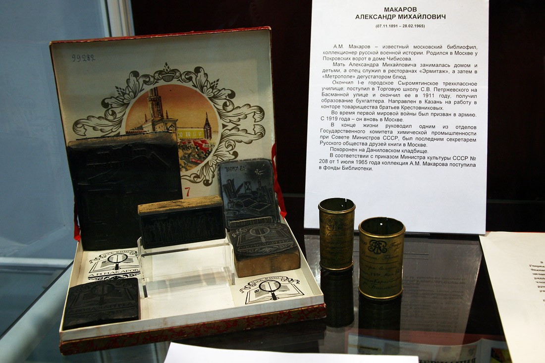 Эти знаки и значительная часть экспозиции являются частью собрания «коллекционера русской военной истории» Александра Макарова, который, как это часто бывает среди коллекционеров, по роду деятельности почти никак не был связан с темой своего собирательства: до революции 1917 года Макаров работал бухгалтером, а в последние годы жизни руководил отделом Государственного комитета химической промышленности при Совете министров СССР. Как военный коллекционер он был хорошо известен и при жизни: журналисты писали о нем в советской прессе, писатели и режиссеры брали консультации. Оставленная им коллекция была посвящена исключительно военному делу, и в 1965 году в соответствии с приказом Министра культуры СССР поступила в РГБ. В библиотеке Макарова было более пяти тысяч томов: воинские уставы за двести лет, памятные книжки об армейском кадровом составе, справочники и каталоги, подшивки газет, энциклопедии и монографии. Кроме книг, Александр Макаров собрал двухтысячную коллекцию боевых орденов и медалей, больше тысячи нагрудных знаков и эмблем, сотни пуговиц и оловянных солдатиков. Солдатики тоже есть на выставке — как те, что были в массовом советском промышленном производстве в юбилейные войне годы, так и ручной работы столетней давности. Многие вещи из коллекции Макарова впервые представлены публике: диплом на звание члена-учредителя Бородинского общества (1913), литография «Посещение Александром I мастерской Дж. Доу в Зимнем дворце» (1826), открытки и т. д. Любопытно, что в этом году сотрудники отдела военной литературы РГБ нашли могилу Александра Макарова на Даниловском кладбище: на выставке также впервые выставляется оригинал экслибриса, который есть и на его могильной стеле.
