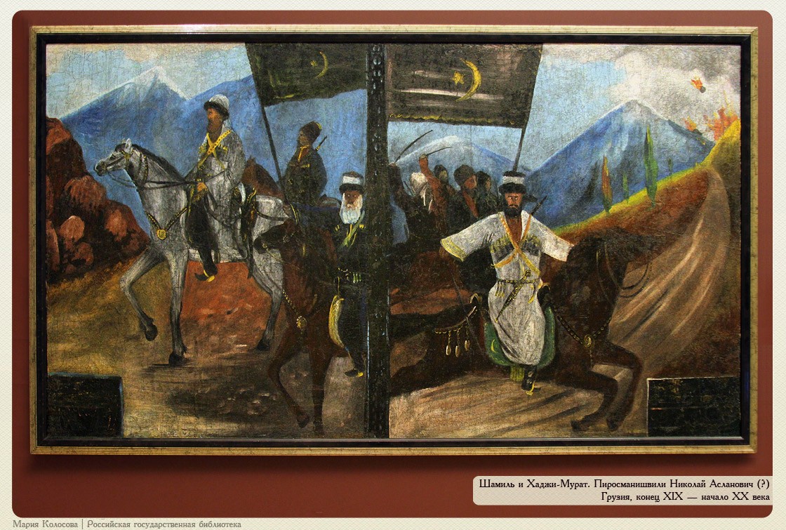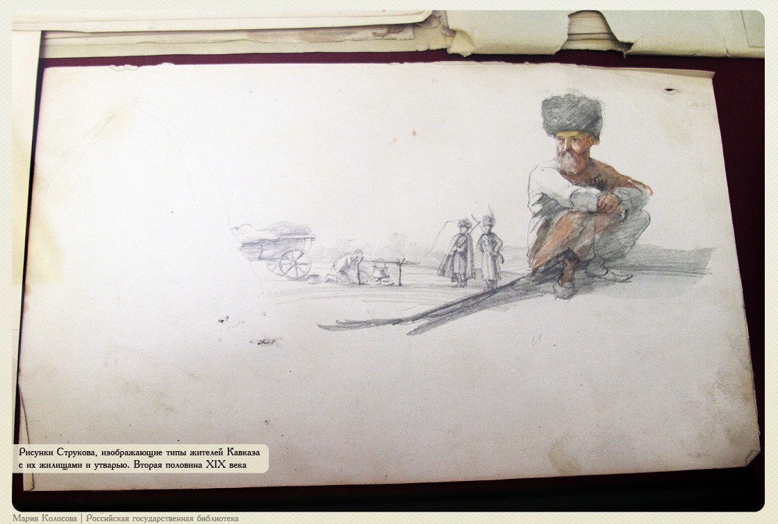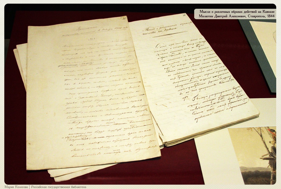 «С тех пор как Россия ведет постепенную и ежегодную войну на Кавказе, не только испытаны были ею все образы действий, не только изменилось отношение к горским племенам, силы и средства с обеих сторон, но и самые виды ее не всегда оставались одинаковыми. Война начата Россиею, можно сказать, по необходимости, из охранения собственных пределов, и принимая мало по малу обширнейшие размеры, получила характер наступательной, с целью покорения племен и утверждения русского владычества на всем пространстве Кавказских гор», — таковы причины Кавказской войны 1817—1864 гг. в «Мыслях о различных образах действий на Кавказе» Дмитрия Алексеевича Милютина, генерала-фельдмаршала, участника боев против отрядов имама Шамиля, военного министра и реорганизатора русской армии. Судя по всему, Кавказ вдохновил военного тактика и на художественное творчество — на выставке представлены не только записки Дмитрия Алексеевича из отдела рукописей РГБ, но и альбом рисунков, с горными пейзажами и «чеченскими физиономиями» .