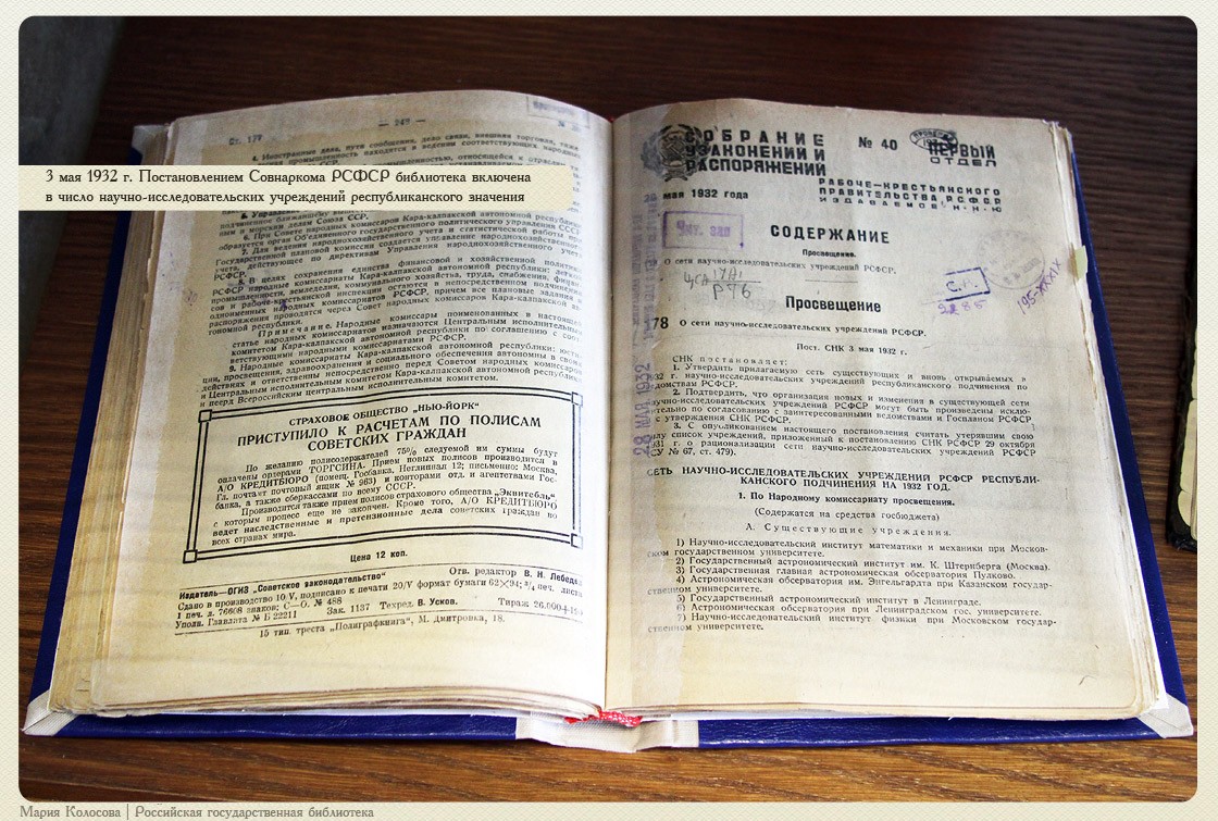 Вполне передает дух времени постановление Совета Народных Комиссаров РСФСР от 23 марта 1932 года «О работе массовых библиотек». В нем отмечался целый ряд недоработок: «неудовлетворительное руководство библиотечным делом со стороны Наркомпроса… недостаточно решительная борьба с извращениями в теории и практике библиотечного дела; неорганизованное, случайное комплектование… недостаточный