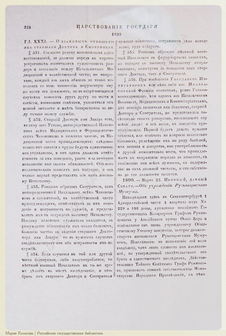 Через семь лет появился утвержденный императором первый и до 1917 года единственный «Устав Московского публичного и Румянцевского музеев». В нем, помимо прочего, указывалось: «Музеи пользуются правом безвозмездно получать по экземпляру всего в России печатаемого, гравируемого и литографируемого как частными лицами, так и казенными ведомствами; по экземпляру фотографируемого в России рукописей и книг; по экземпляру тех из конфискованных или удержанных цензурным учреждением или таможней заграничных изданий».