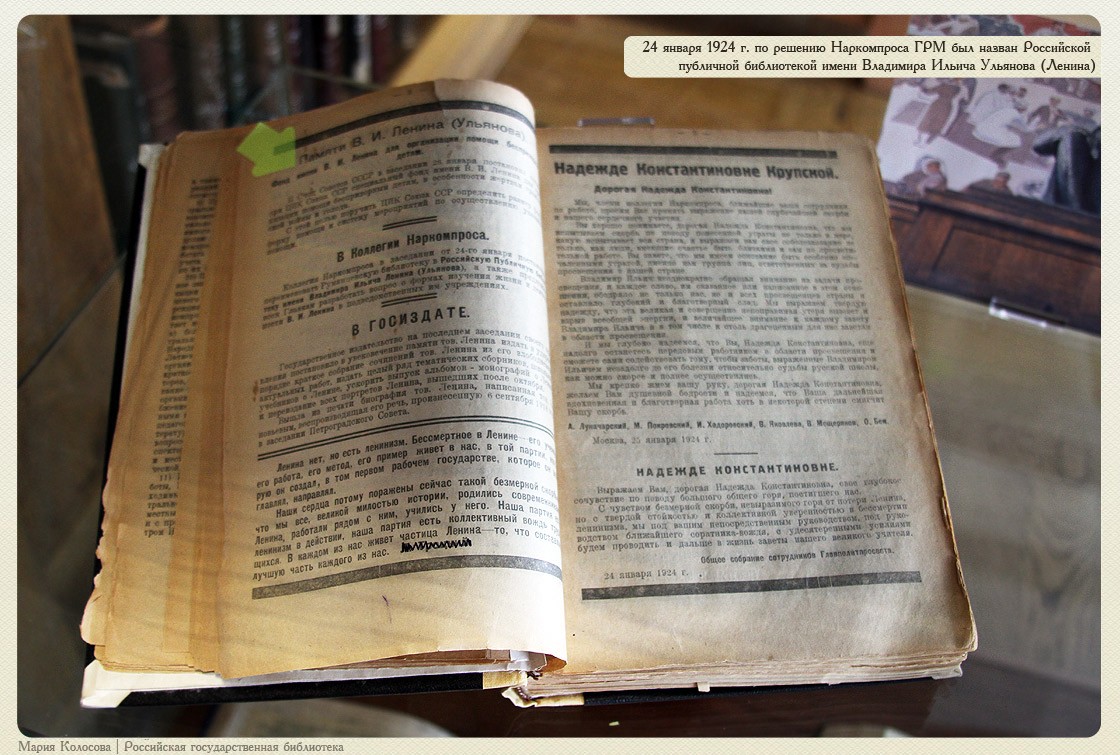 24 января 1924 года по решению Наркомпроса Государственный Румянцевский музей был переименован в Российскую публичную библиотеку имени Владимира Ильича Ульянова (Ленина), хотя официально (об этом свидетельствуют документы) он еще больше года носил прежнее название.