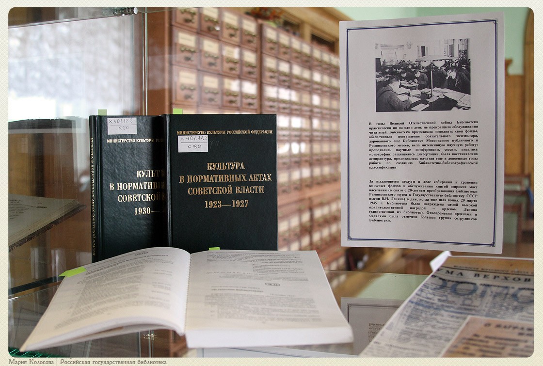 В читальном зале отдела официальных и нормативных изданий РГБ открыта выставка, посвященная 150-летнему юбилею Российской государственной библиотеки. Читатели могут познакомиться с текстами документов, которые определяли и регламентировали ее деятельность. В императорских указах, декретах Совнаркома, правительственных постановлениях наглядно отражались перемены в судьбе главной библиотеки страны.