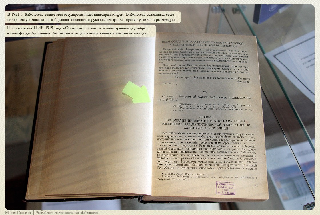 В документах революционного времени формулируются новые задачи, и появляется новая лексика. Из декрета СНК РСФСР от 17 июля 1918 года «Об охране библиотек и книгохранилищ», подписанного председателем Совета народных комиссаров В. Ульяновым (Лениным) и управляющим делами СНК В.