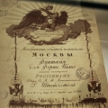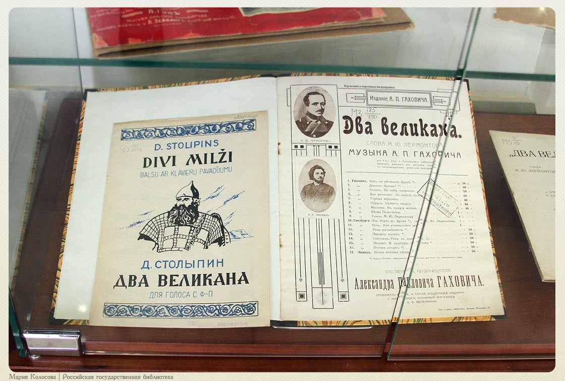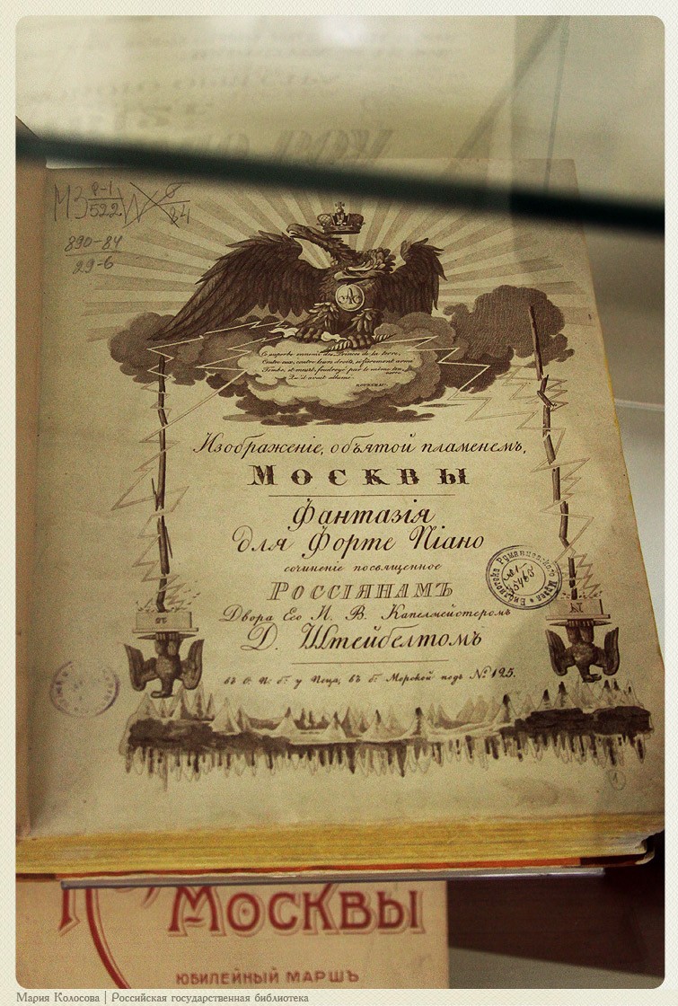 Разумеется, много внимания уделено Александру I и Наполеону. Интересны вокальные произведения на текст лермонтовских «Двух великанов», где поэт в аллегорической форме описал противостояние императоров. На выставке можно увидеть живописно оформленные ноты «Изображения объятой пламенем Москвы» (фантазия Даниэля Штейбельта), выпущенные в петербургском издательстве К. Петца. На титульном листе — двуглавый орел в лучах славы с вензелем Александра I и поверженные на землю одноглавые орлы, символизирующие герб Бонапарта.