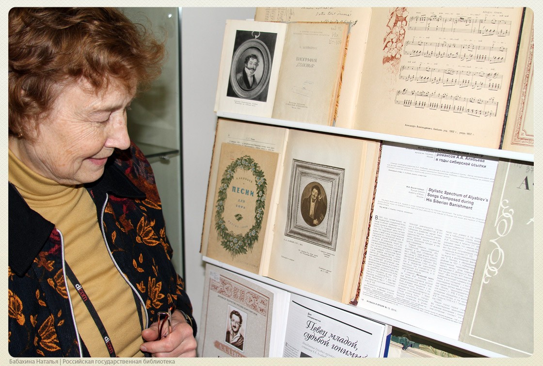 Перед началом круглого стола гости имели возможность увидеть на выставочных стендах издания произведений Алябьева из фондов РГБ, в том числе из редких и особо ценных нот, вокальные партии романсов композитора, произведения камерной и фортепианной музыки. Всего около 50 нотных изданий, а также книги об Алябьеве (музыковедческие труды Бориса Штейнпресса, Бориса Доброхотова и Бориса Хавторина), журнальные и газетные статьи — все это составило небольшую выставку в концертном зале Дома Пашкова.