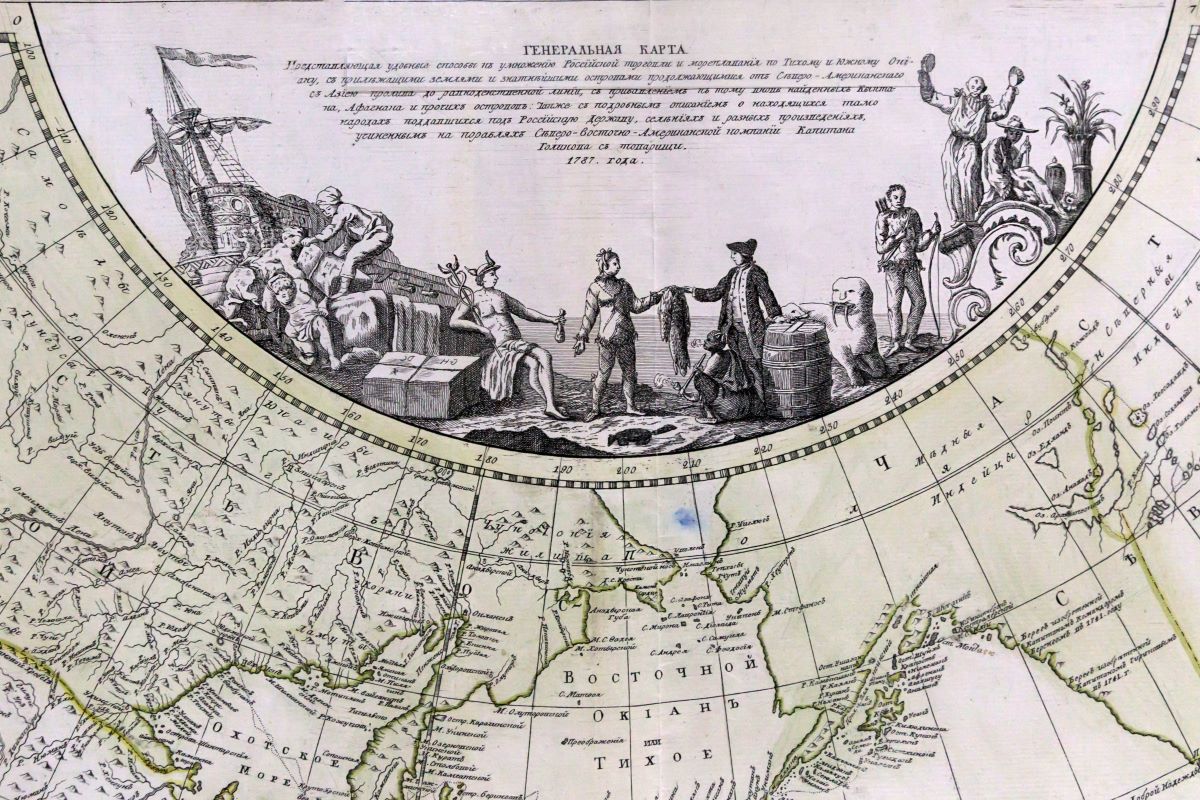 • Генеральная карта, представляющая удобные способы к умножению российской торговли и мореплавания по Тихому океану, с прилежащими землями и знатнейшими островами… [1: 10 000 000], 100 км в 1 см. [Санкт-Петербург], 1787. 1 л. : раскраш., 1 доп. карта, ил., грав. ; 59×83 см