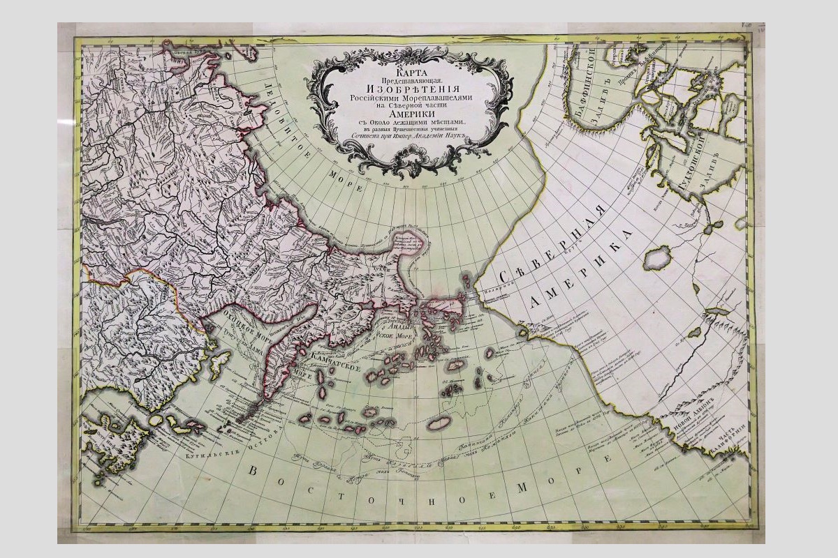 • Карта, представляющая изобретения российскими мореплавателями на северной части Америки с около лежащими местами в разные путешествия учиненные / сочинена при Императорской Академии наук. [1:16 000 000], 160 км в 1 см. [Санкт-Петербург, 177-]. 1 л. : раскраш., ил., грав. ; 69×51 см