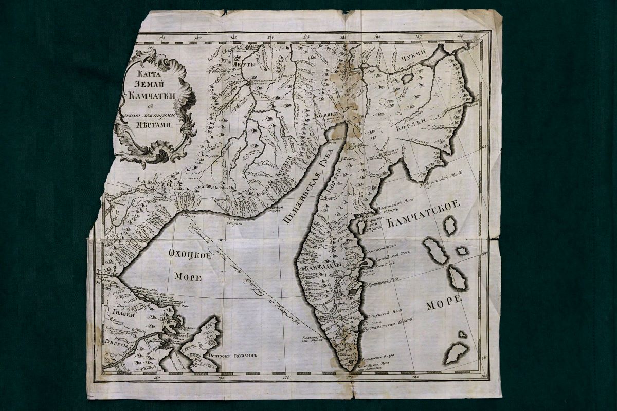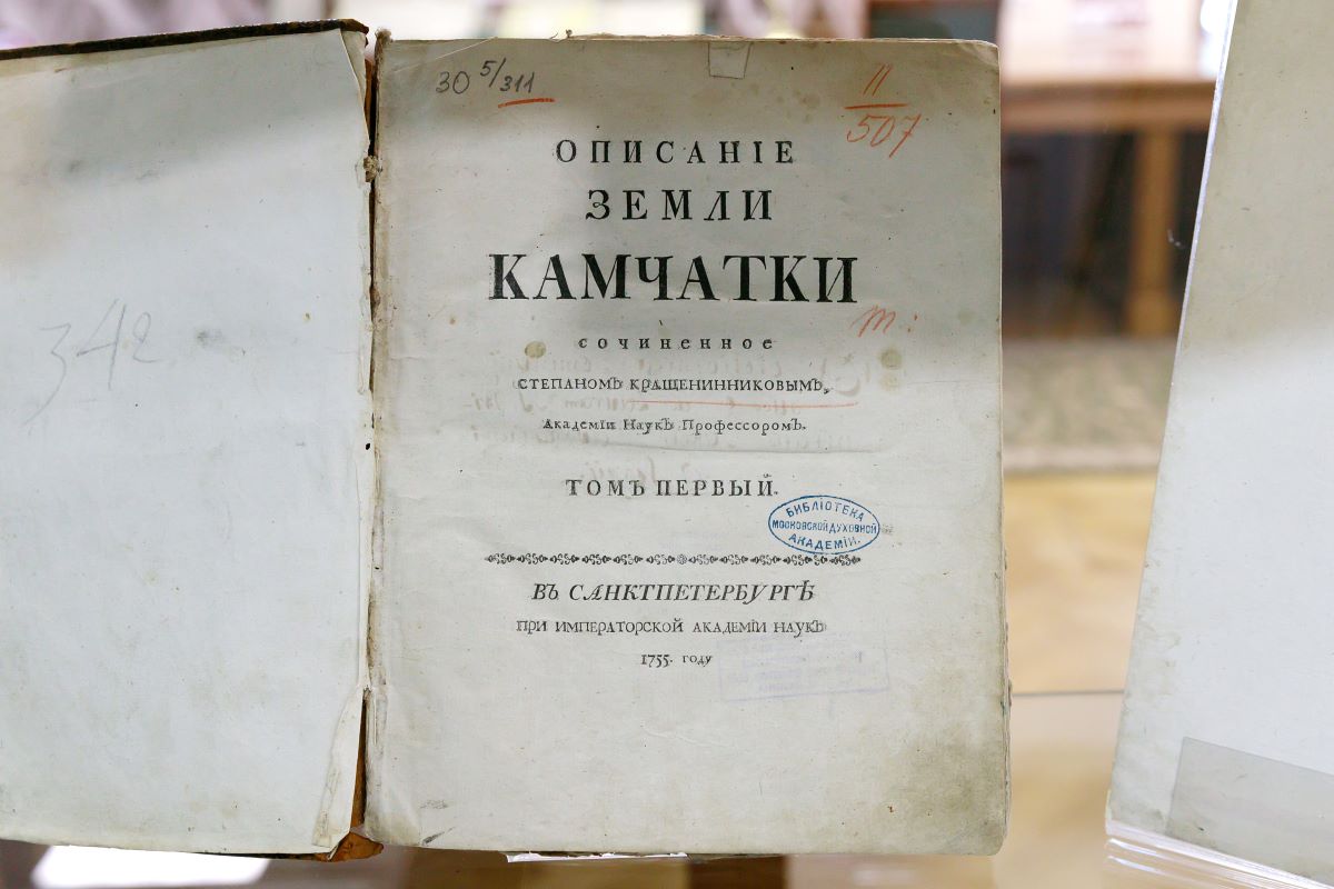 В 1737 году участник Второй Камчатской экспедиции Степан Крашенинников отделился от основной экспедиции и по заданию Миллера отправился в самостоятельное путешествие с целью изучения полуострова Камчатки. Проведя на Камчатке четыре года, Крашенинников составил полное описание истории освоения края, его природных условий, собрал материалы по геологии, этнографии, ботанике и зоологии. «Описание земли Камчатки, сочинённое Степаном Крашенинниковым, Академии наук профессором» вышло в свет в 1755 году. Оригинал этого замечательного произведения, занявшего достойное место в истории науки, входит в состав экспозиции выставки.