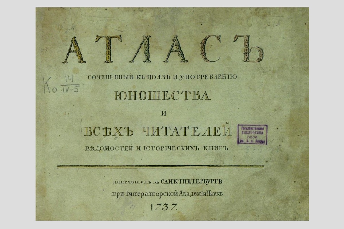 • Атлас, сочиненный к пользе и употреблению юношества и всех читателей ведомостей и исторических книг. Санкт-Петербург : при Императорской Академии Наук, 1737. 1 атлас (27 карт) : цв. ; раскраш., грав.; 21×25 см