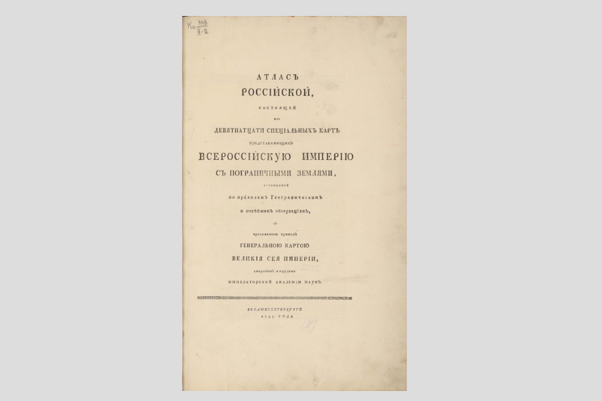 • Атлас Российский, состоящий из девятнадцати специальных карт, представляющих Всероссийскую Империю с пограничными землями, сочинённый по правилам географическим и новейшим обсервациям, с приложенной притом генеральной картой Великой сей Империи, старанием и трудами Императорской Академии Наук. Санкт-Петербург : Академия наук, 1745. 1 атлас (20 карт) : одноцв., грав. ; 54×34 см