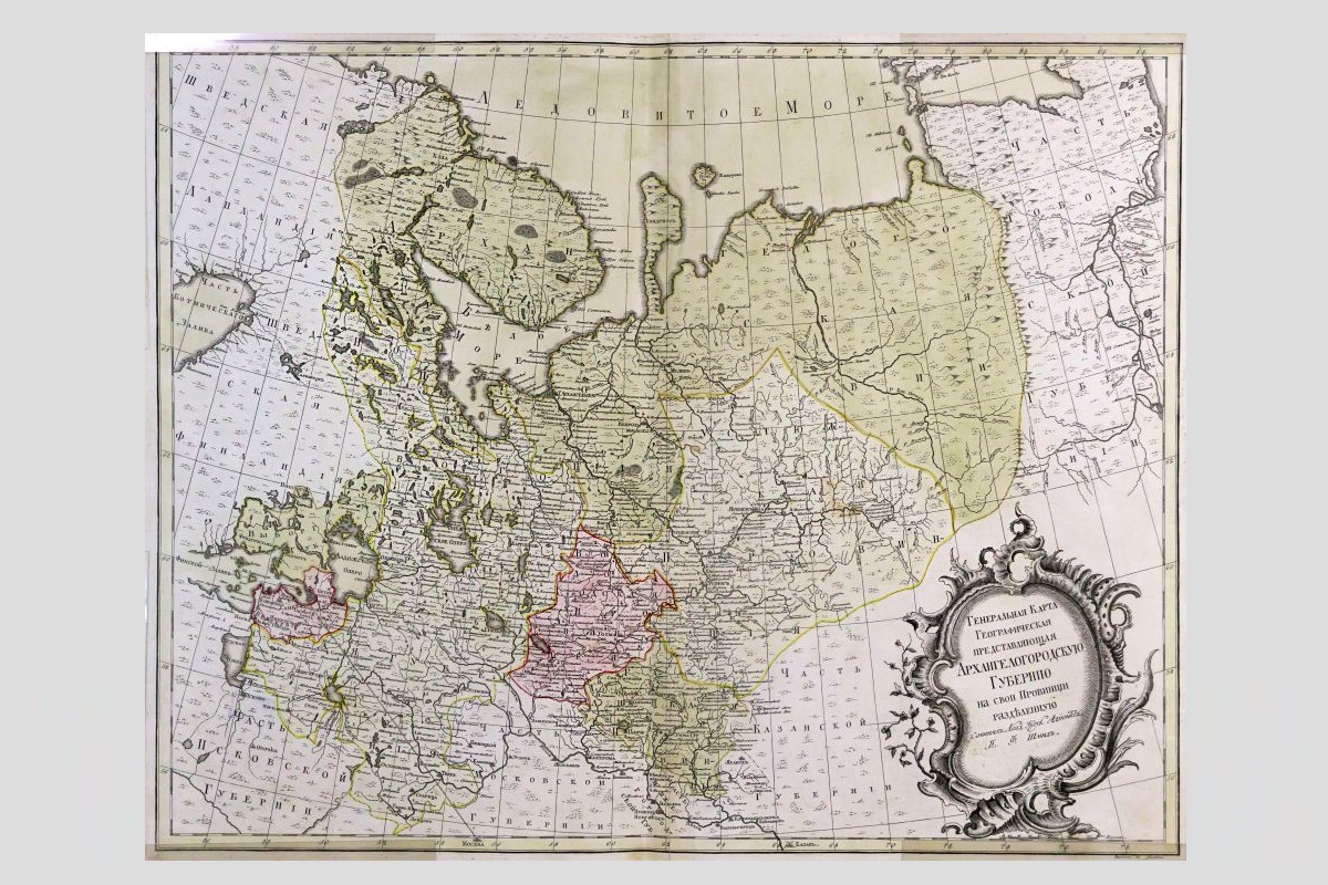 • Генеральная карта географическая, представляющая Архангелогородскую губернию на свои провинции разделенную / соч. Академии наук адъюнкт Я. Ф. Шмид ; вырез. Е. Худяков. [1:3 780 000], 37,8 км в 1 см. [Санкт-Петербург, 1773]. 1 л. : раскраш., грав. ; 52×74 см
