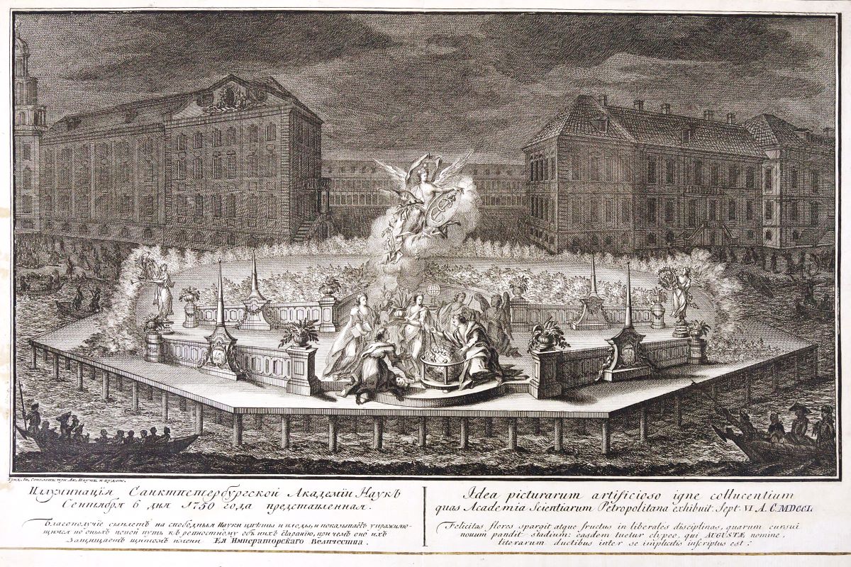 • Иллюминация Санктпетербургской Академии наук сентября 6 дня 1750 года представленная. Благополучие сыплет на свободные науки цветы и плоды, и показывает упражняющимся во оных новой путь к ревностному об них старанию, причем оно их защищает щитом имени Ее Императорского Величества / грид. Ив. Соколов при Академии наук и худож. : [эстамп]. [Санкт-Петербург, 1750]. 1 л. : офорт, резец ; 24,3×35,8 см