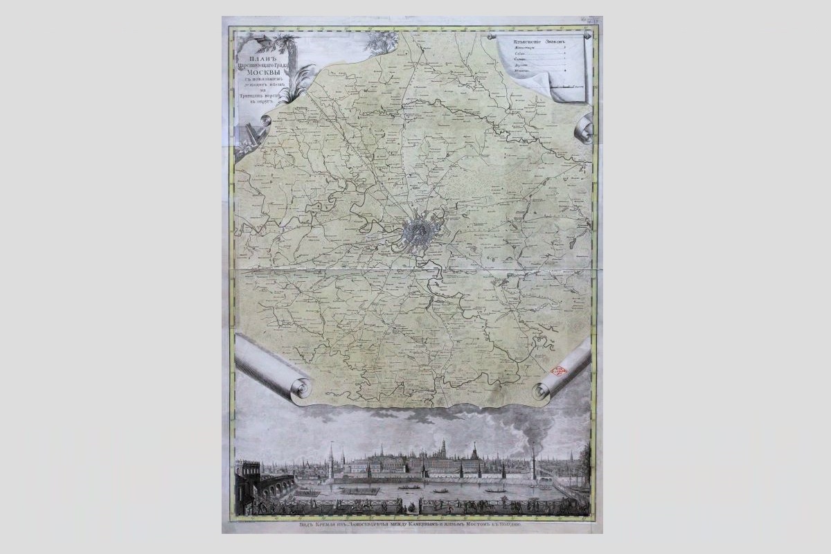 • План царствующего града Москвы с показанием лежащих мест на тридцать вёрст в округе / проспект снимал М. М. Махаев. [1:126 000], 1,26 км в 1 см. [Санкт-Петербург : Академия наук, 1763]. 1 л. : одноцв., ил., грав. ; 80×57 см