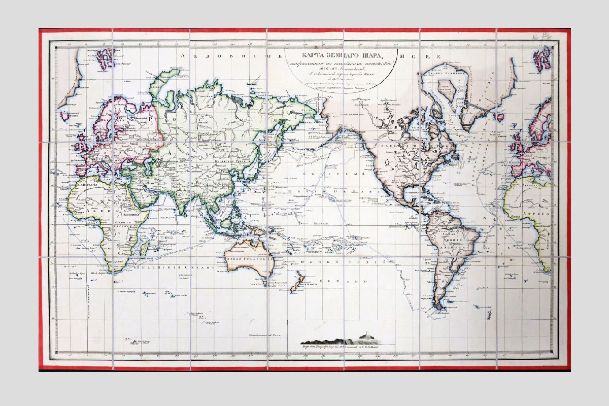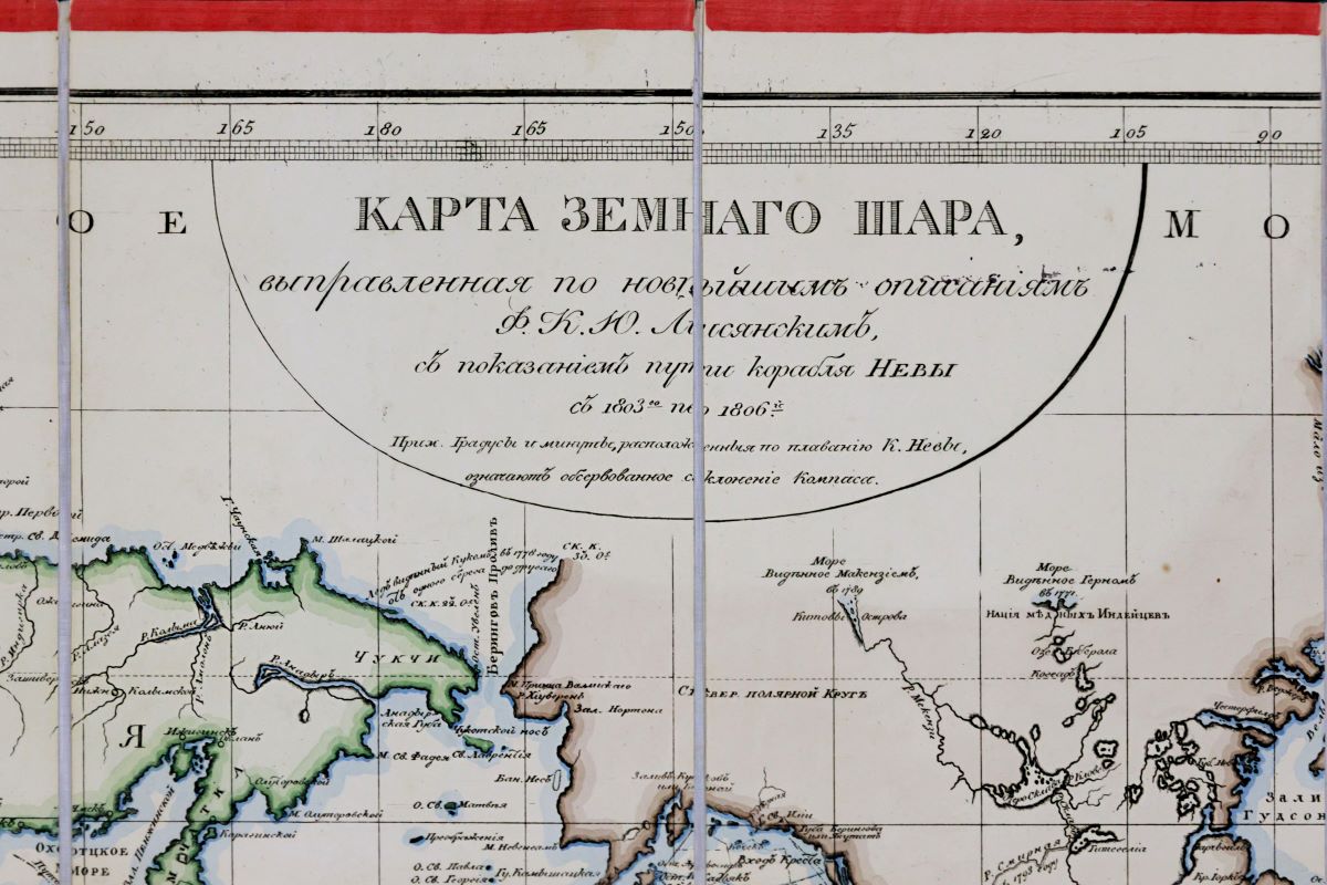 • Карта земного шара, выправленная по новейшим описаниям Ф. К. Ю. Лисянским, с показанием пути корабля Невы с 1803 по 1806 г. [1:55 500 000], 555 км в 1 см. Санкт-Петербург, 1806. 1 л. : цв., раскраш., грав. ; 59×95 см