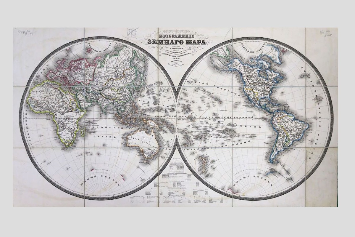 • Изображение земного шара / сост. Л. Лангером. [1:55 500 000], 550 км в 1 см. Санкт-Петербург : Глазунов, 1849. 1 л. : цв., раскраш. ; 58,5×105,5 см