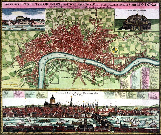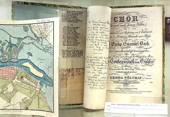 Представленные на выставке карты XVIII века позволяют не только проследить жизненный путь Карла Филиппа Эмануэля Баха и творческую деятельность Кристофа Виллибальда Глюка , но и познакомиться с великолепными образцами картографического искусства. Особый интерес вызывают гравированные карты с ручной раскраской — « План города Гамбурга » (Augsp[urg, 17.]) с помещенной в художественную рамку панорамой города, украшенной гербами и гравюрами; « План города Лейпцига и его окрестностей » (Leipzig: F. B. Klein , 1788) и « План города Лондона » (London: Wallis, 1795), наклеенные на ткань; « План города Франкфурта-на- Одере » (Berlin: Nicolaischen Buch, 1785), выполненный на бумаге с филигранью. Выделяются также « План крепости Милан » (S. l., 1735), где заглавие на немецком и итальянском языке помещено в картуш в виде ленты, и « План города Лондона » (N ü rnberg: Homann, [17.]), гравированный на бумаге с филигранью немецким картографом Иоганном Батиста Хоманном. Экземпляр раскрашен вручную, украшен рисунками с видами города, под картографическим изображением помещена панорама города, на которой обозначены главные городские объекты.