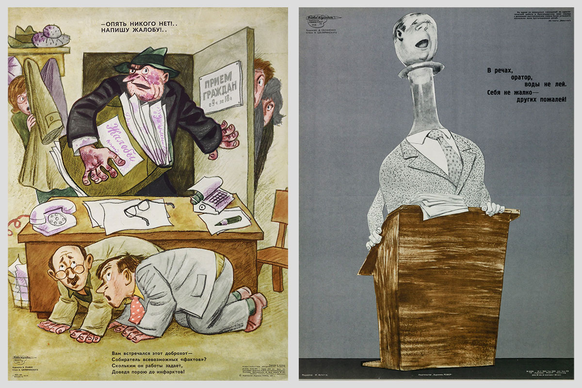 Справа: В речах, оратор, воды не лей... Художник — Д. Обозненко, автор стихов — А. Шкляринский. 1964