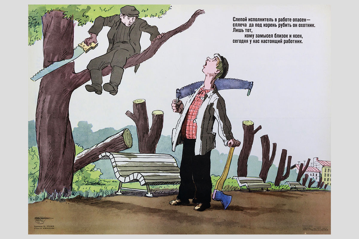 Слепой исполнитель в работе опасен... Художник — Ю. Трунев, автор стихов — В. Алексеев. 1968