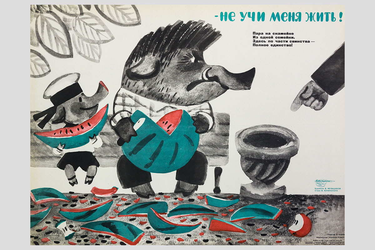Слева: Вам встречался этот доброхот… Художник — В. Травин, автор стихов — А. Шкляринский. 1973
