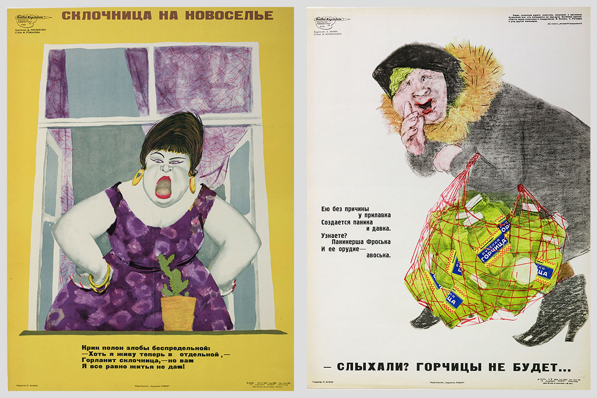 Слева: Склочница на новоселье. Художник — Д. Обозненко, автор стихов — М. Романов. 1963
