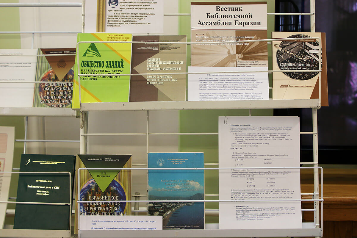 Большой раздел выставки раскрывает историю и основные направления деятельности БАЕ, аспекты партнёрства и сотрудничества национальных библиотек стран СНГ с Российской государственной библиотекой. Материалы официального печатного органа — научно-практического журнала «Вестник Библиотечной Ассамблеи Евразии» освещают процессы интеграции на пространстве СНГ и деятельность библиотек стран СНГ. Журнал информирует научную и библиотечную общественность о значимых культурных и научных событиях, о профессиональной жизни библиотечного сообщества на пространстве Содружества.