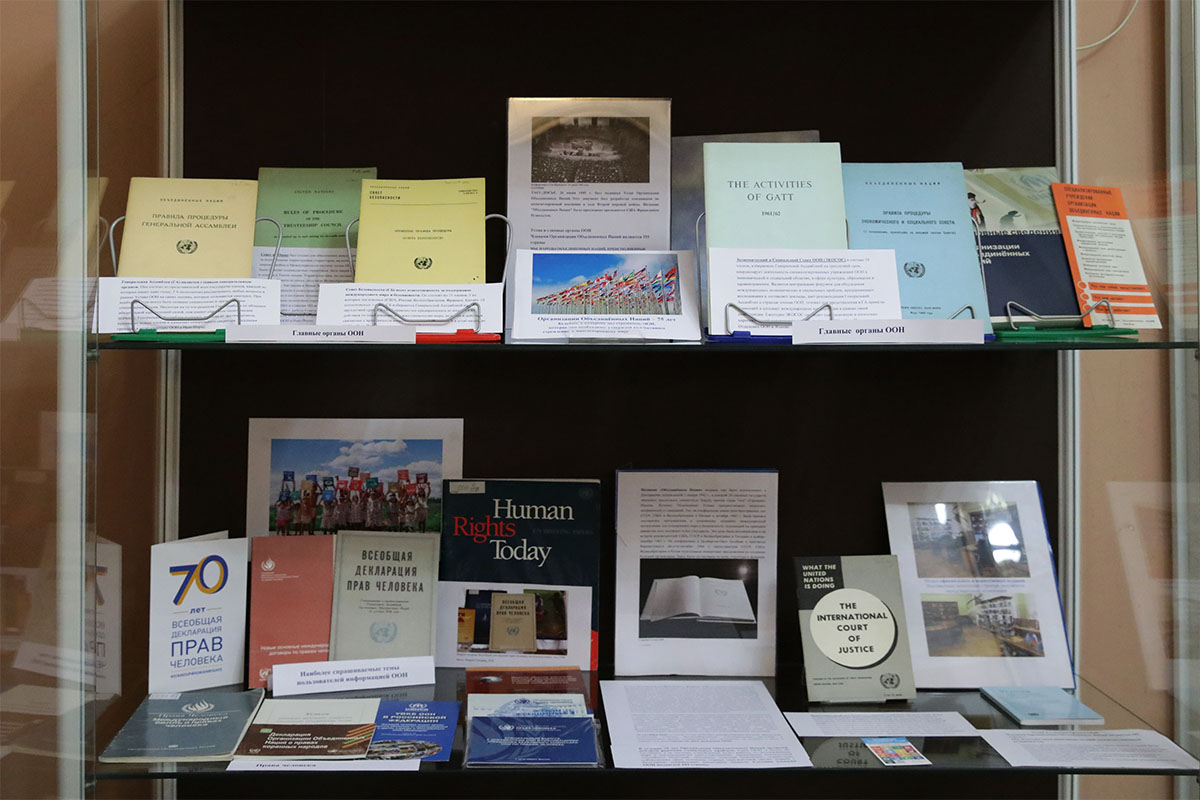 На выставке рассказывается об истории ООН, о деятельности её главных органов. Здесь представлены справочники ООН за разные годы, редкие издания, среди которых Правила процедуры Совета Безопасности, Генеральной Ассамблеи, ЭКОСОС и других главных органов ООН, Устав ООН и первое издание Всеобщей декларации прав человека на русском языке.
