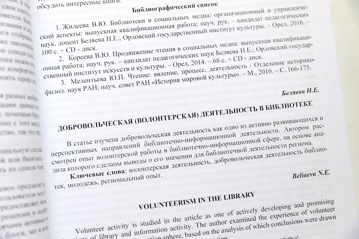 Беляева Н. Е. Добровольческая (волонтерская) деятельность в библиотеке // Культура, наука и искусство — современные векторы развития вуза культуры : материалы Международной научно-практической конференции (Орёл, 15–16 марта 2018 года). Орёл, 2018. C. 45–47