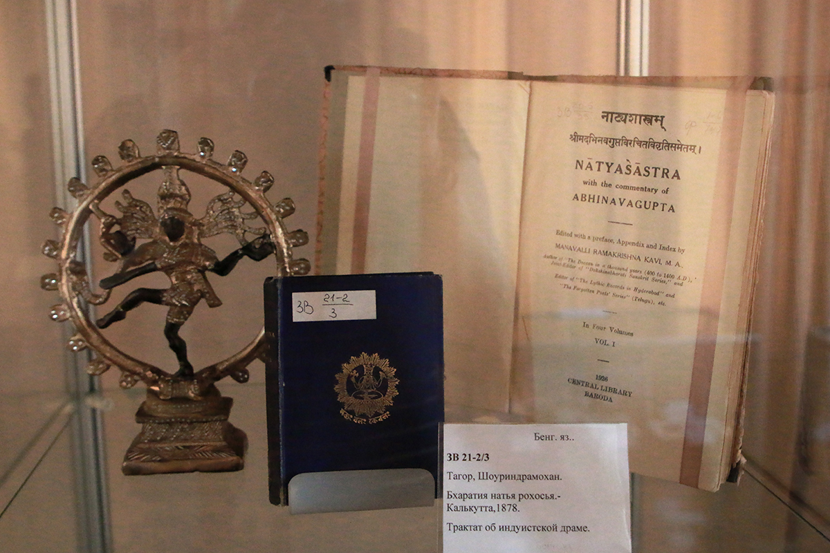 Среди экспонатов раздела, посвящённого индийскому театру, стоит отметить «Трактат об индуистской драме» Шоуриндрамохана Тагора (Калькутта, 1878) и древнеиндийский текст на санскрите, один из крупнейших и древнейших трактатов по театральному искусству и теории драмы и музыки — «Натьяша́стра» с комментариями Абхинава Гупты (Барода, 1926). Составление текста заняло несколько веков и, возможно, началось в IV веке до н.э. Индуистская традиция приписывает авторство текста ведийскому мудрецу Бхарати Муни. Это объёмное произведение в 36 главах, которое даёт исчерпывающие сведения о малейших деталях представления, описывает все стороны театрального искусства.