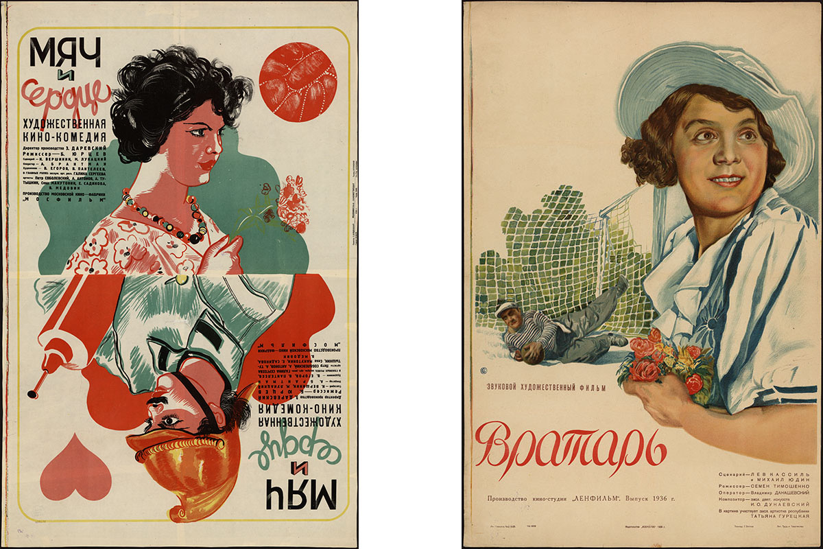 Один из самых ярких киноплакатов выставки — к фильму «Мяч и сердце», снятому в 1935 году режиссёрами Борисом Юрцевым и Константином Юдиным. Это одна из последних немых кинокомедий — экраны уже прочно захватывало звуковое кино. Фильм получил низкую оценку Главного управления кинофотопромышленности СССР за « низкий идейный и художественный уровень » . Вскоре режиссёр Борис Юрцев был арестован и сослан. Кинокартина была смыта, оценить её мы не сможем, но плакат к ней сохранился в фондах РГБ.