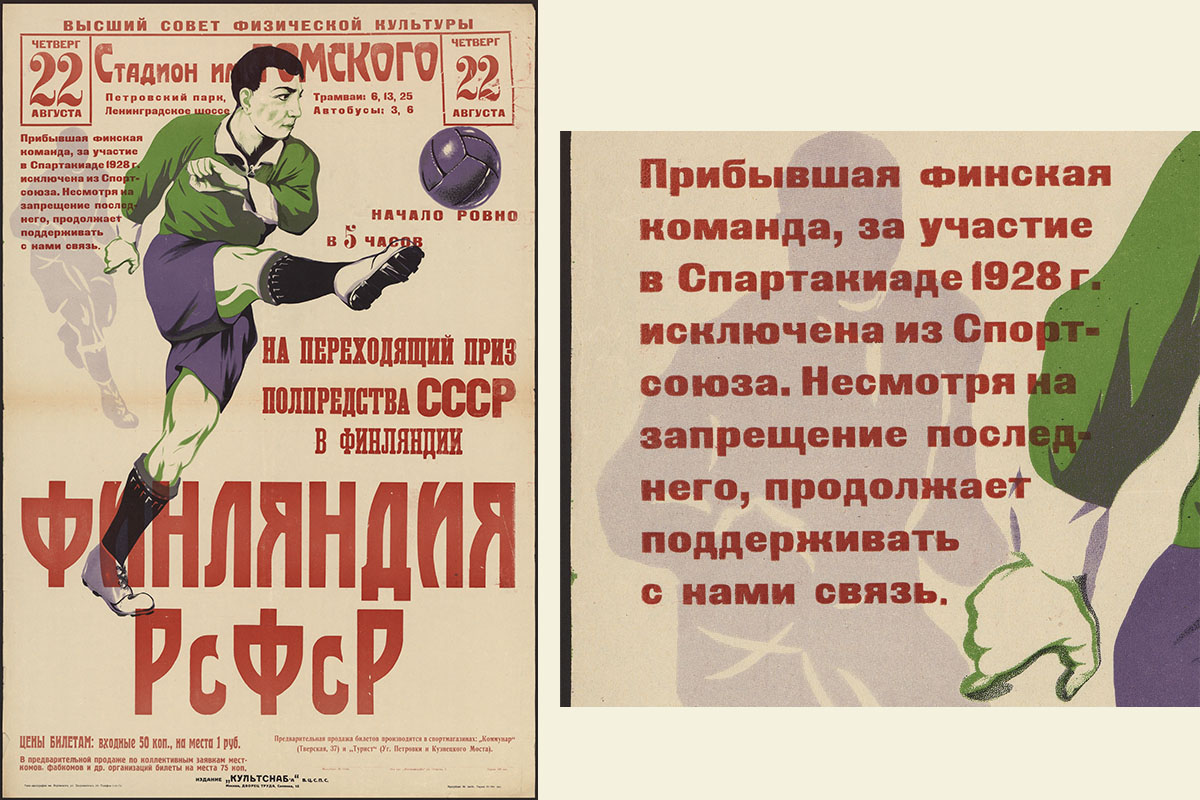 В отрывке описывается международный матч. И три афиши таких матчей — Уругвай — Москва (1928), Дания — Москва (1929) и Финляндия — РСФСР (1929) вошли в экспозицию выставки. Эти плакаты — настоящий кладезь информации о жизни страны тех лет. Где будет проходить матч, как добраться до стадиона, сколько стоил входной билет и сколько — билет с местом... Даже видно, что плакаты печатались в два этапа: сначала делалась заготовка с фигурой футболиста, а затем допечатывались сведения о конкретном матче. Но это ещё не всё. Если внимательно рассмотреть афишу матча Финляндия — РСФСР, можно увидеть такой текст: «Прибывшая финская команда за участие в Спартакиаде 1928 г. исключена из Спортсоюза. Несмотря на запрещение последнего, продолжает поддерживать с нами связь».