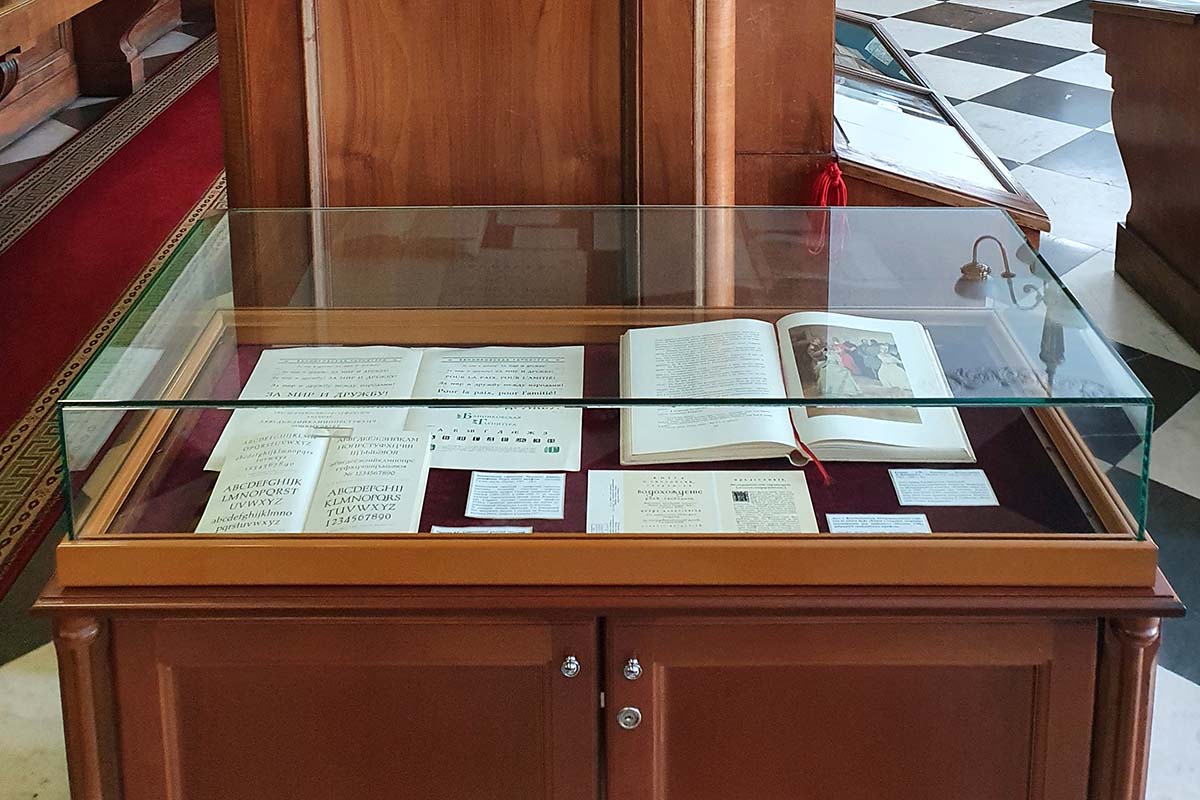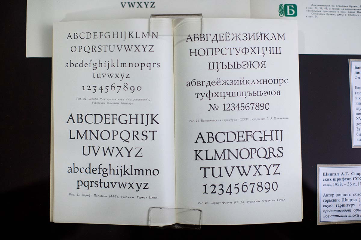 На мини-выставке в Музее книги представлены проспекты отдела новых шрифтов НИИ «Полиграфмаша» шрифтовых гарнитур «Банниковская», «Байконур» и «Кама», издания, набранные «Банниковской» гарнитурой, тезисы доклада Галины Банниковой на секции шрифта и орнамента из коллекции книговеда Алексея Алексеевича Сидорова.