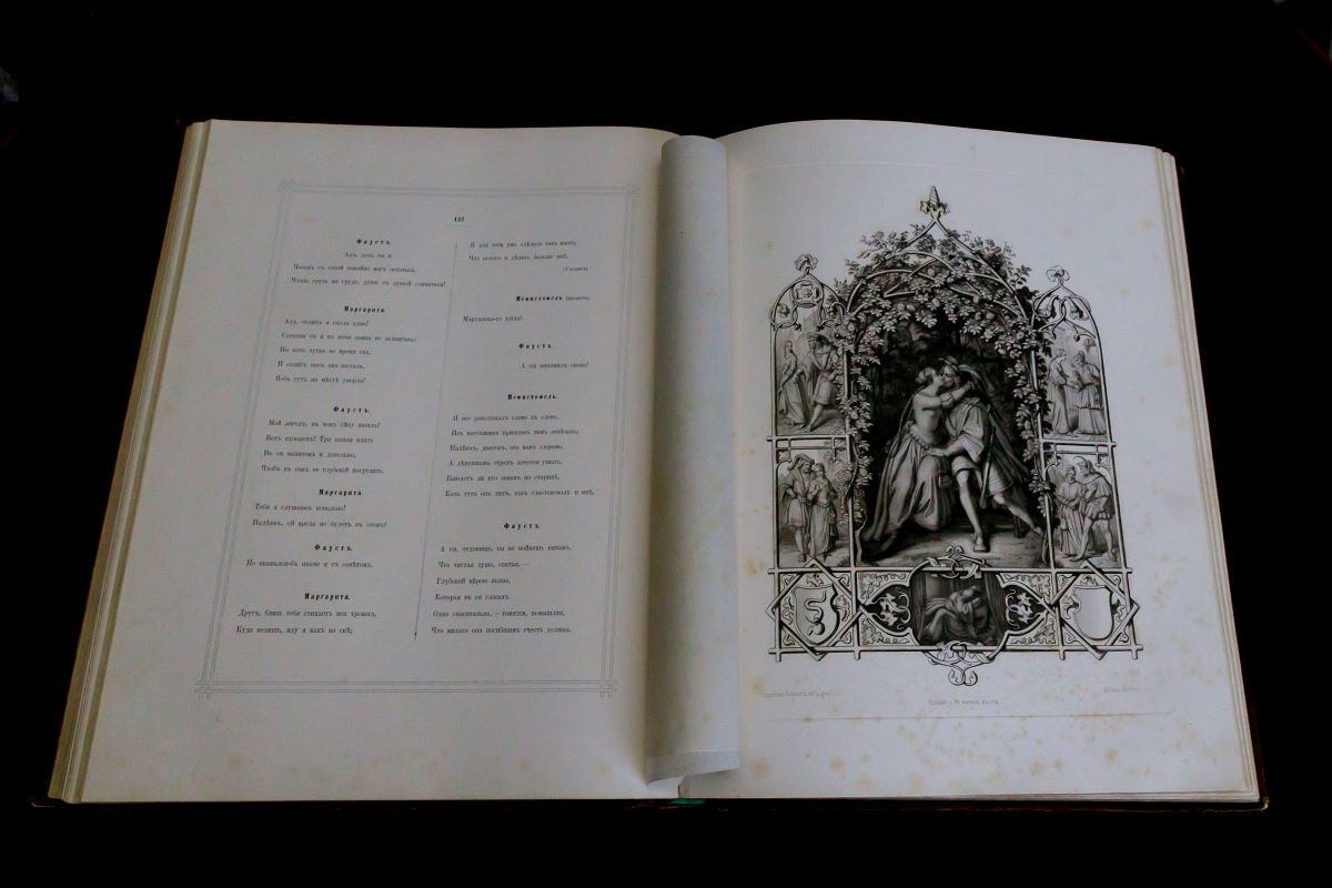 Второе представленное в этой витрине издание — перевод «Фауста» Афанасия Фета с иллюстрациями Энгельберта Зейбертца, вышедший в издательстве Адольфа Маркса в Санкт-Петербурге. Этот внушительный том стал своеобразным эталоном изданий пьесы на русском языке, воспроизведения гравюр Зейбертца используются для иллюстрирования даже современных изданий.
