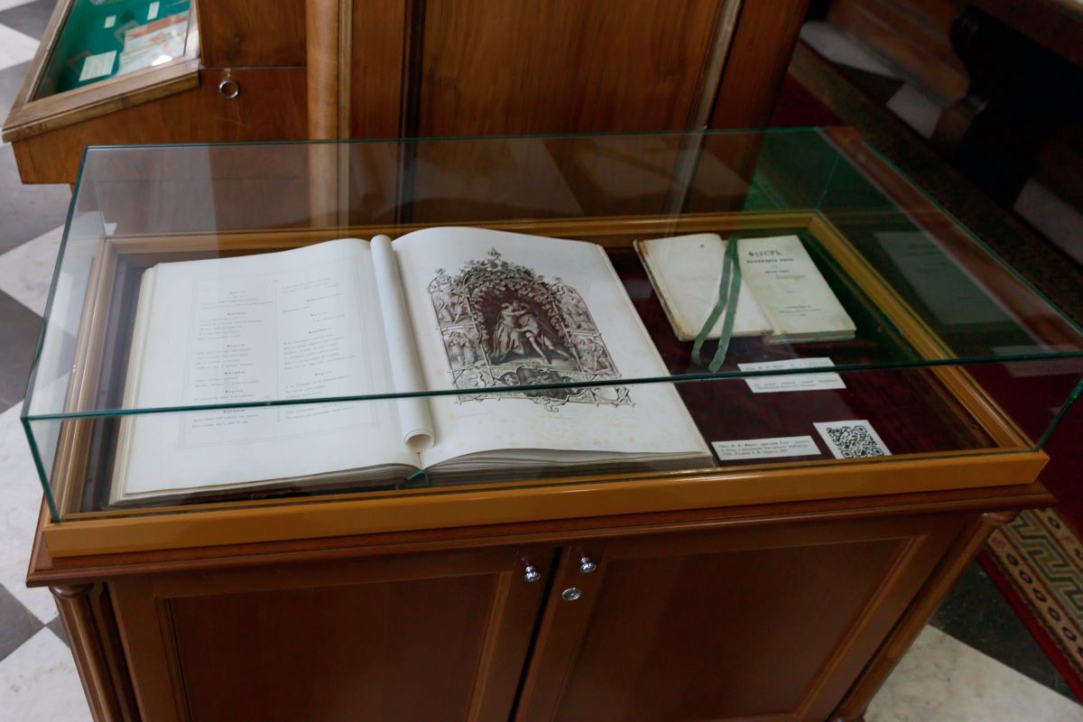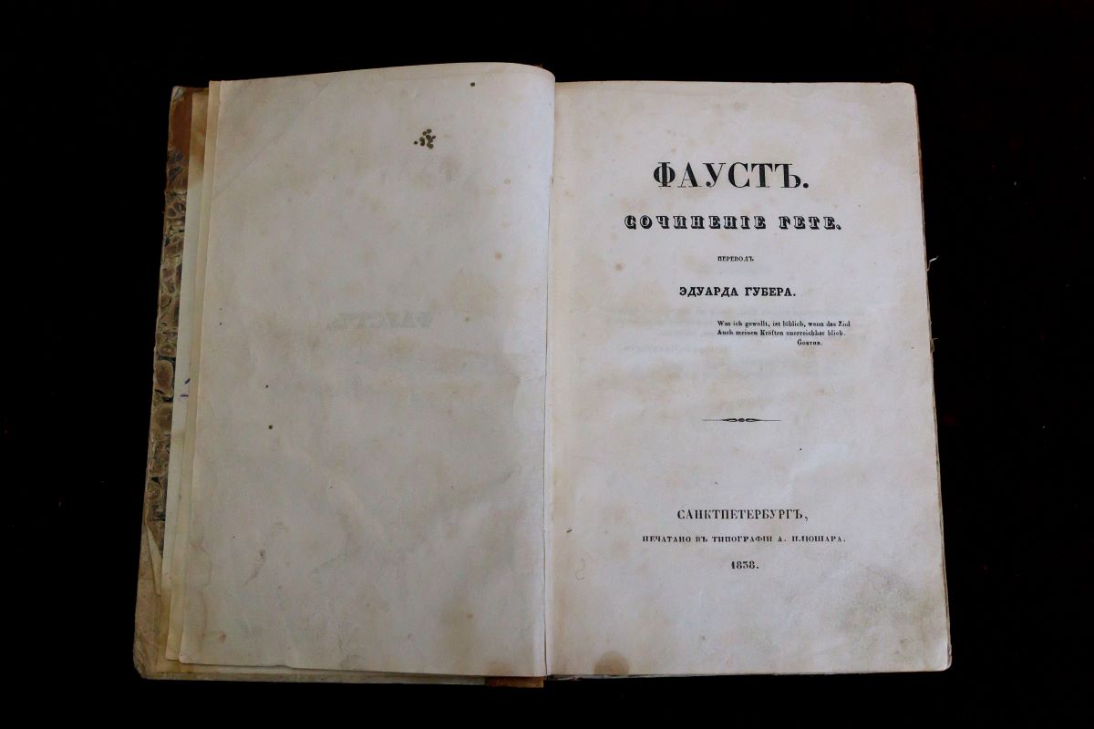 Первое издание «Фауста» представлено в постоянной экспозиции Музея книги. На юбилейной мини-выставке одна из витрин посвящена истории издания пьесы на русском языке. Здесь можно увидеть первый перевод «Фауста» авторства Эдуарда Губера. История этого издания пронизана мистикой не меньше, чем действие самой пьесы: переводчик посвящает свой труд «незабвенной памяти» Александра Пушкина и утверждает, что великий поэт очень сочувственно отнёсся к его начинанию, принимал в нём живое участие и давал советы, однако никаких доказательств тому не находится. Верить ли этой версии или нет, каждый решает для себя сам.
