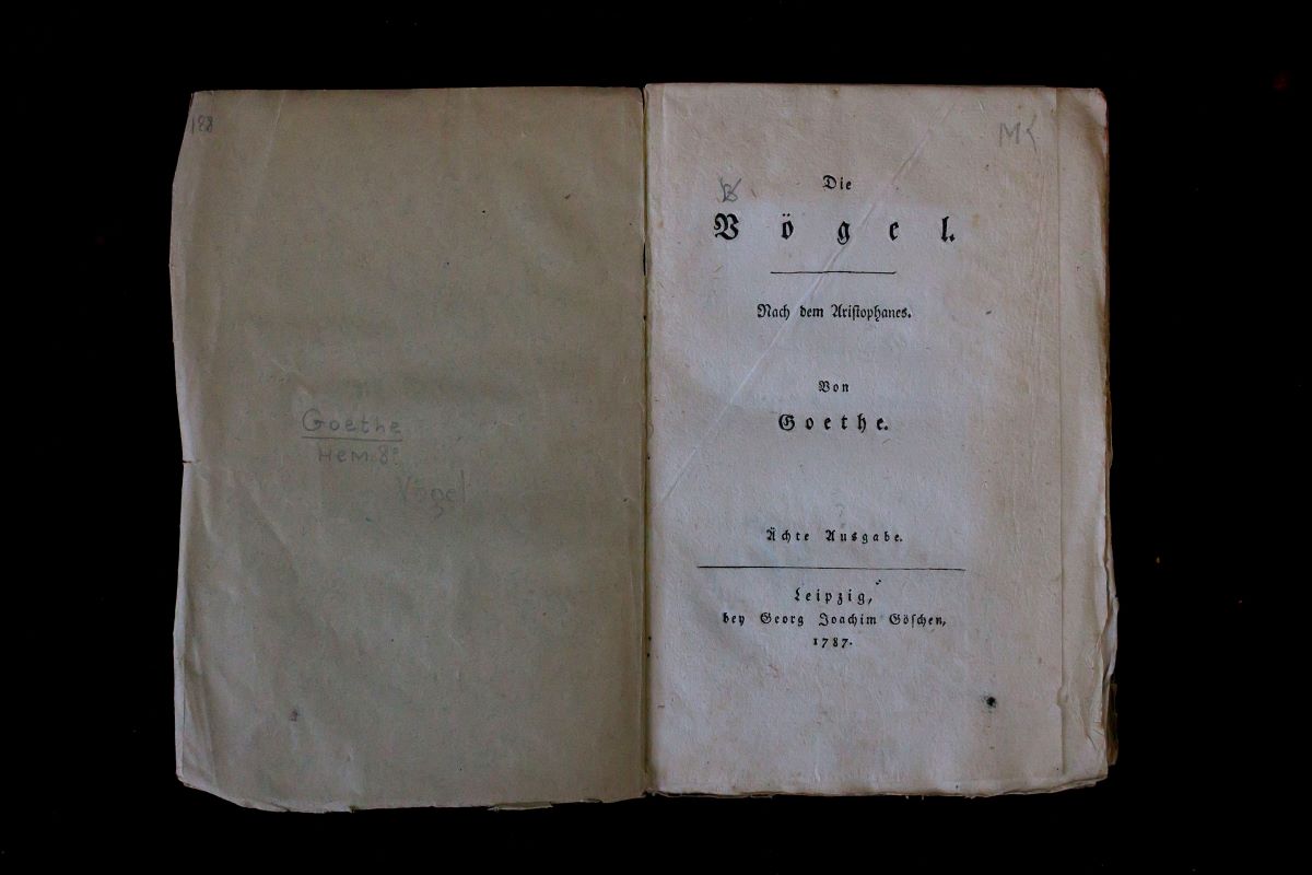 Johann Wolfgang von Goethe. Die Vögel. Nach dem Aristophanes. Von Goethe. 8-te Ausg. Leipzig : bey Georg Joachim Göschen, 1787